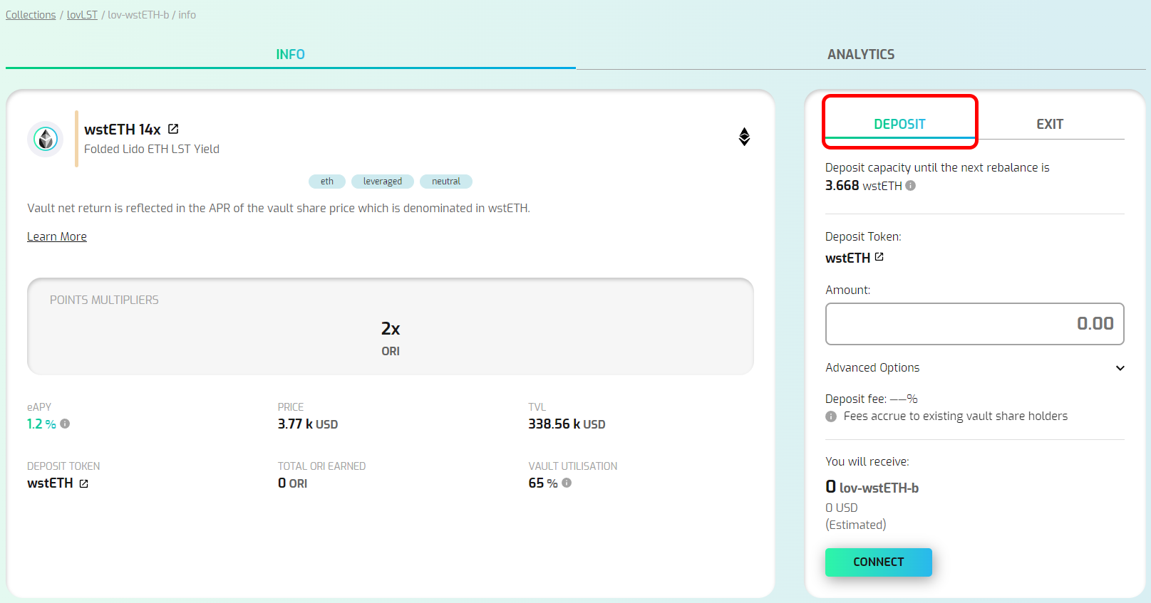 <figure><img src="https://1838495634-files.gitbook.io/~/files/v0/b/gitbook-x-prod.appspot.com/o/spaces%2FuQqfnSZUSHvj0FdEt8I8%2Fuploads%2FRMDxWYm2b7stREtWUEAM%2FDeposit%20wstETH%2014x%20Vault.png?alt=media&#x26;token=5380a424-2fa1-4524-9382-fbb4002564c6" alt=""><figcaption><p>Click Deposit to access the wstETH 14x vault</p></figcaption></figure>