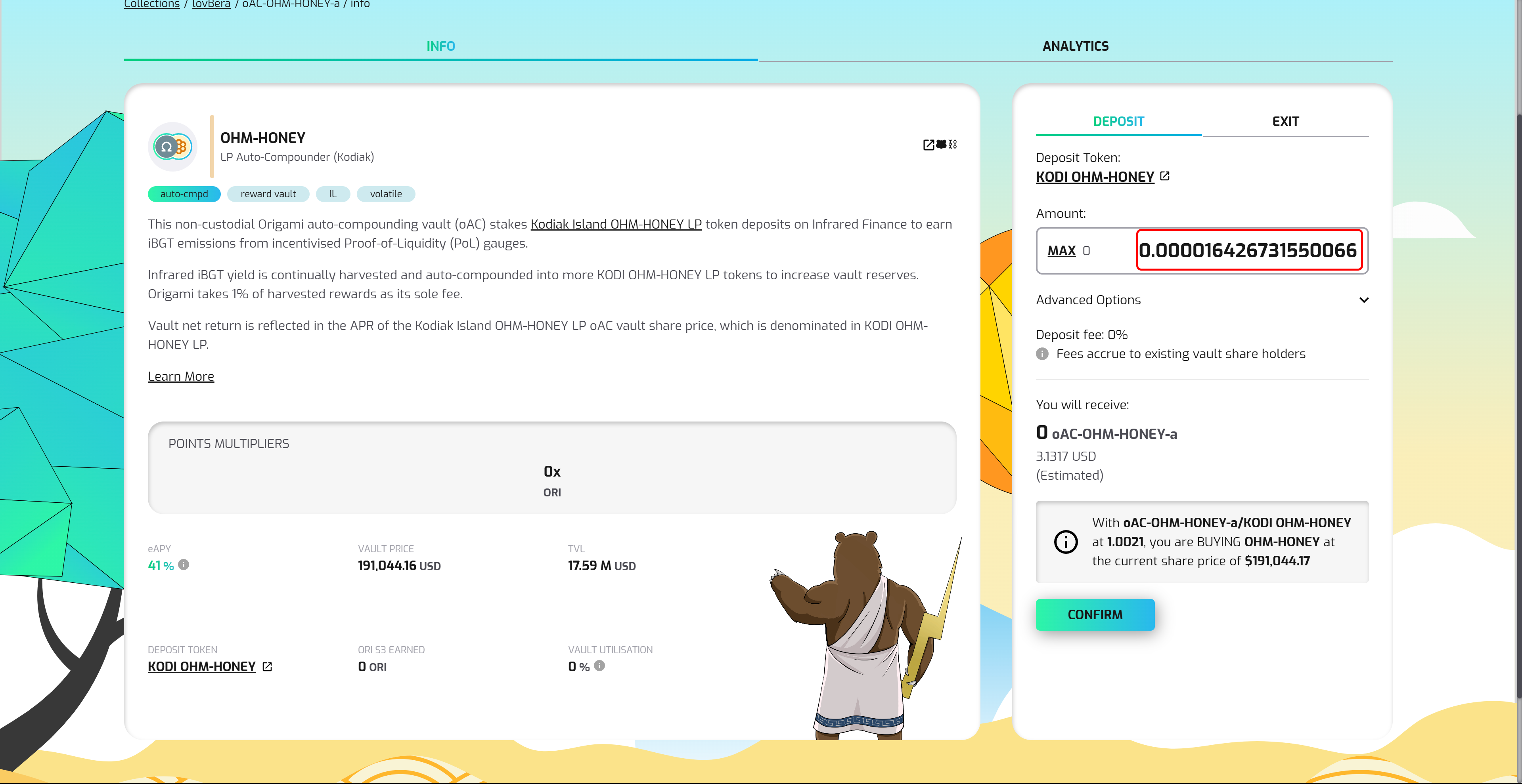 Click Deposit to access the OHM-HONEY vault
