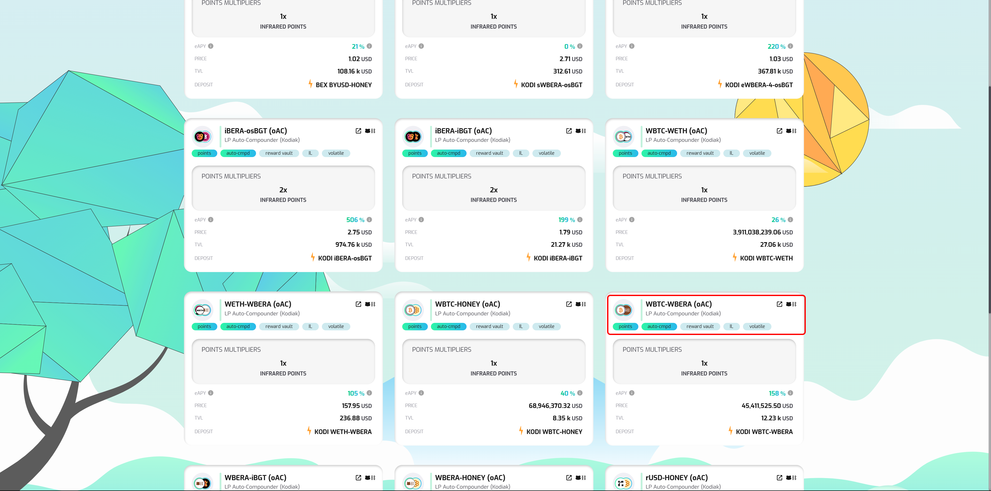 <figure><img src="https://1838495634-files.gitbook.io/~/files/v0/b/gitbook-x-prod.appspot.com/o/spaces%2FuQqfnSZUSHvj0FdEt8I8%2Fuploads%2FZapFEnCLkc5u6VHmBEnH%2FoAC%20WBTC-BERA%20Click%20Vault.png?alt=media&#x26;token=169fdb68-97df-4acf-a614-bec50dacd431" alt=""><figcaption><p>Select the WBTC-BERA vault from the list to access the vault features</p></figcaption></figure>