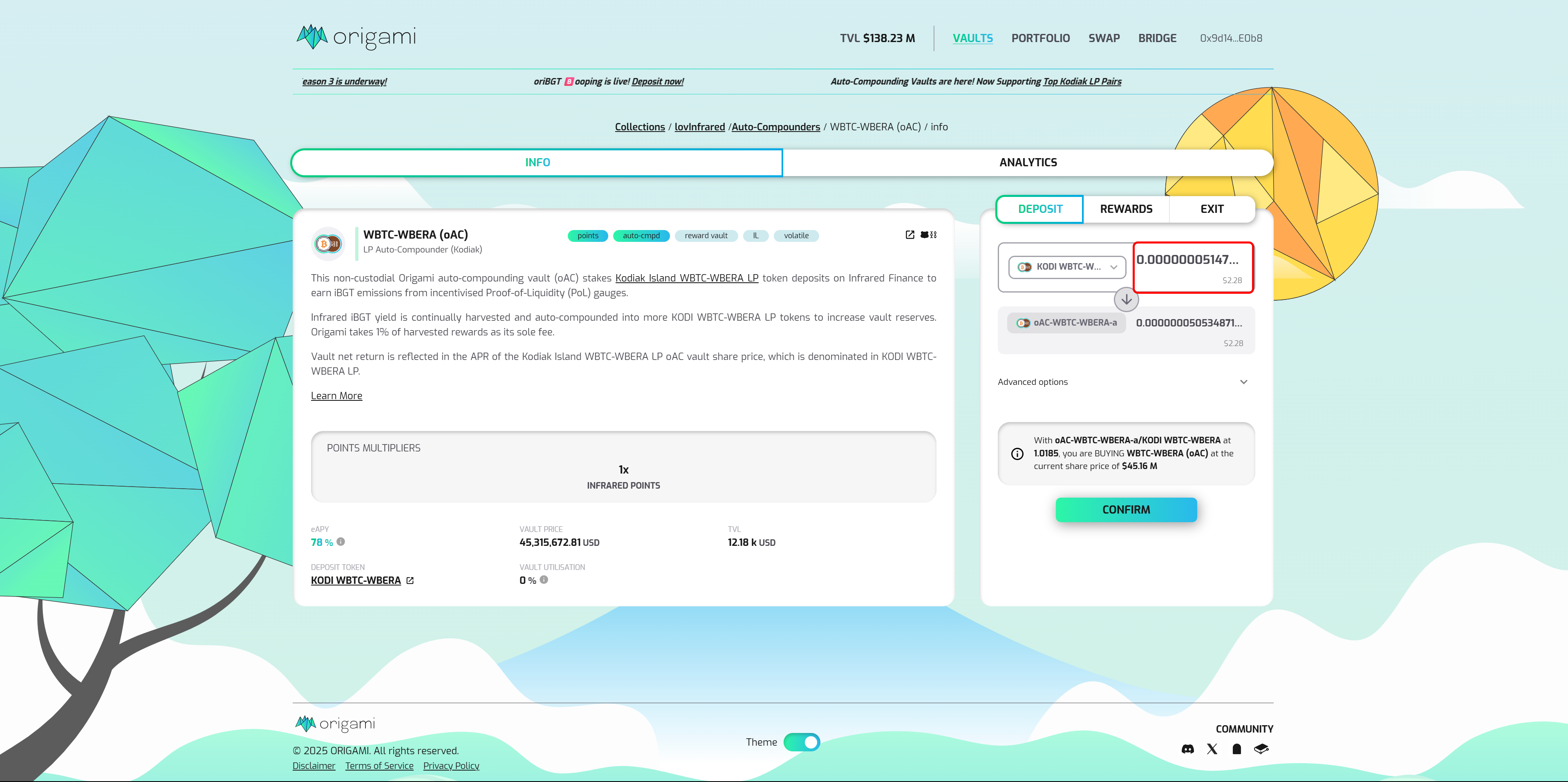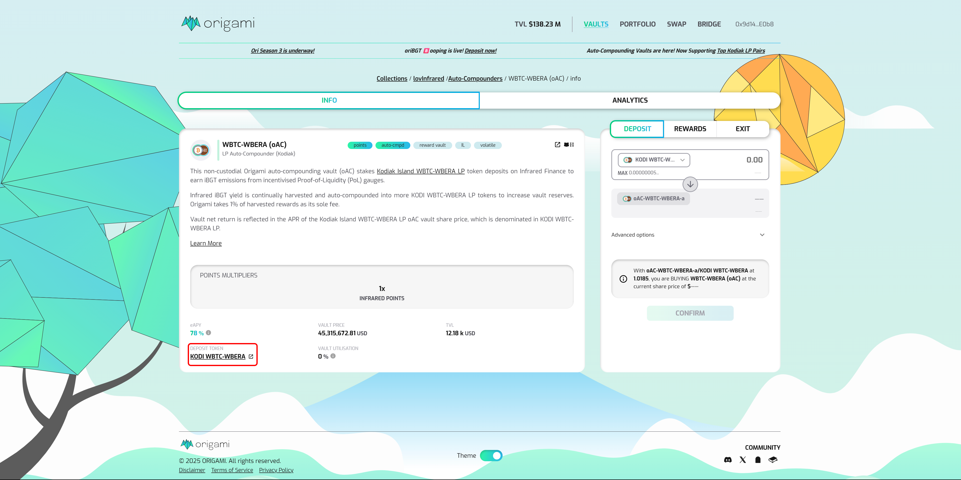 <figure><img src="https://1838495634-files.gitbook.io/~/files/v0/b/gitbook-x-prod.appspot.com/o/spaces%2FuQqfnSZUSHvj0FdEt8I8%2Fuploads%2F8Zk617c2tUsoEyg4zfzb%2FoAC%20WBTC-BERA%20Click%20Deposit.png?alt=media&#x26;token=c0d7d103-7ebf-4a71-964c-d0795b8f9117" alt=""><figcaption><p>Click Deposit to access the WBTC-BERA vault</p></figcaption></figure>