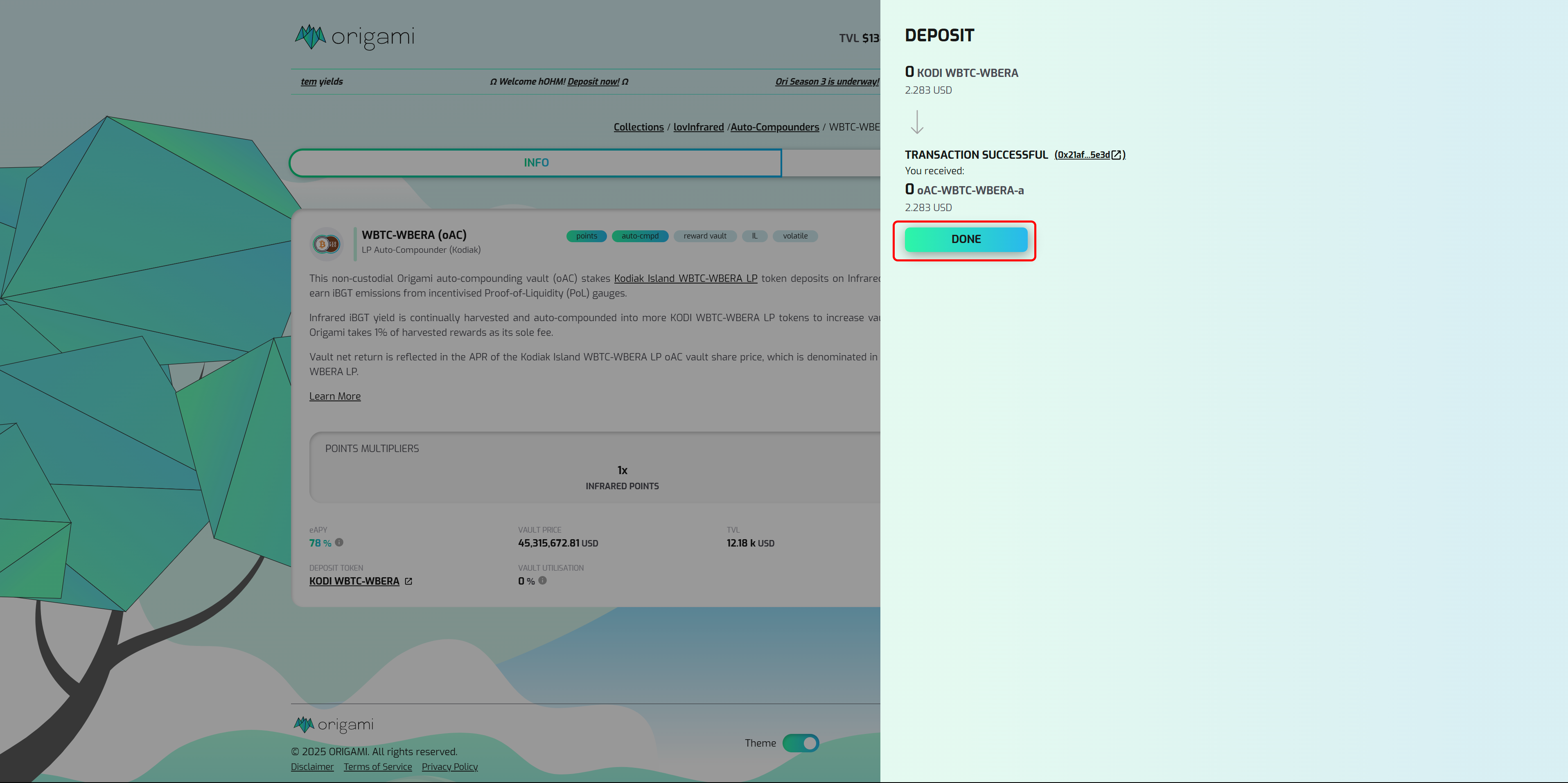 <figure><img src="https://1838495634-files.gitbook.io/~/files/v0/b/gitbook-x-prod.appspot.com/o/spaces%2FuQqfnSZUSHvj0FdEt8I8%2Fuploads%2Fmwf3hSM2oPt5pRKPNZJV%2FoAC%20WBTC-BERA%20Done.png?alt=media&#x26;token=6e898df9-2db6-422d-a9d3-e4d7d33681c7" alt=""><figcaption><p>Click DONE once the transaction is successful</p></figcaption></figure>
