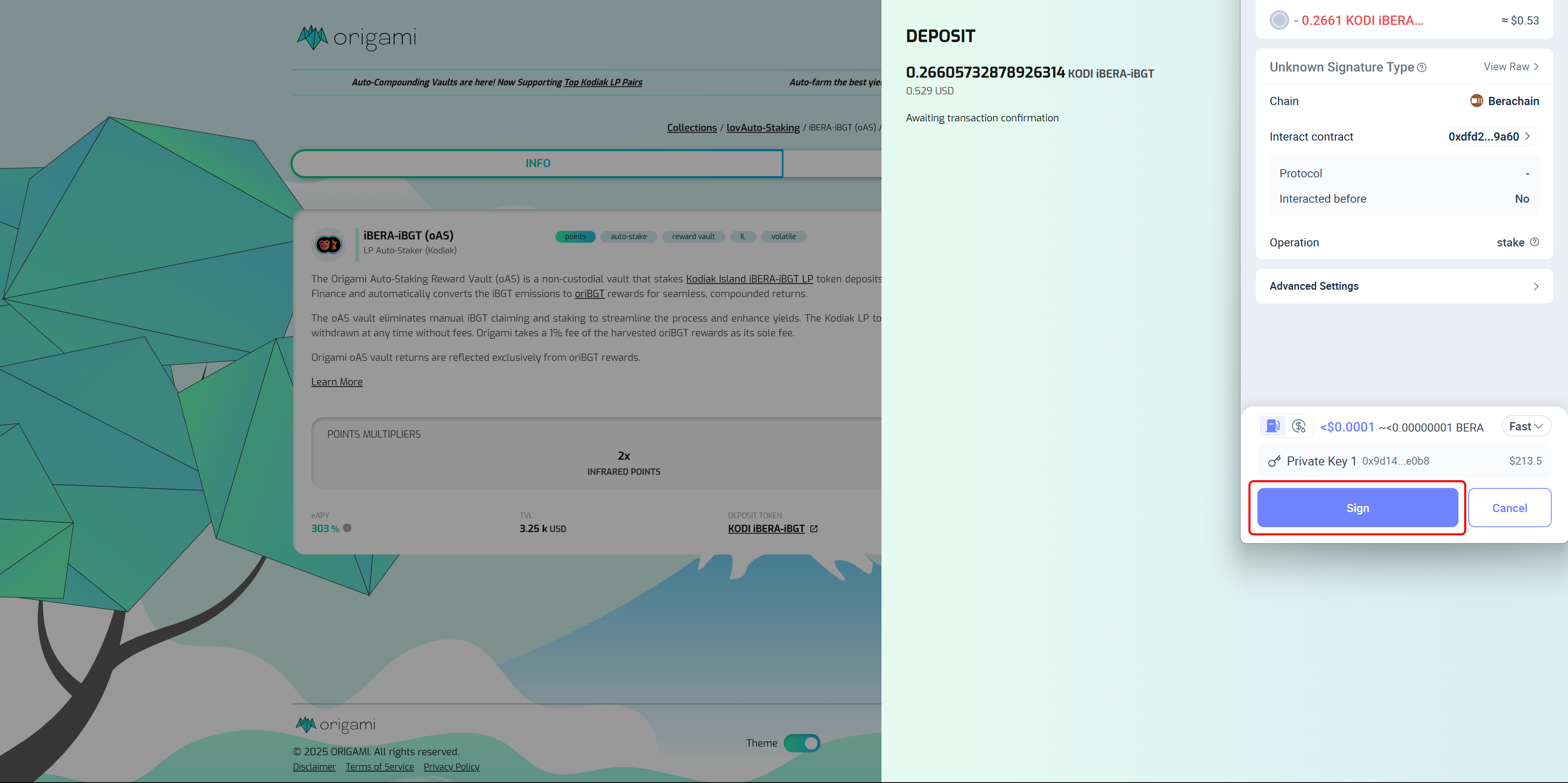 <figure><img src="https://1838495634-files.gitbook.io/~/files/v0/b/gitbook-x-prod.appspot.com/o/spaces%2FuQqfnSZUSHvj0FdEt8I8%2Fuploads%2FN0j39SeekVoRsJowv4ev%2FSign%20Disclaimer.png?alt=media&#x26;token=a03d99e5-025b-4a02-a4d3-7a7631c58648" alt=""><figcaption><p>Click on Sign if all Terms of Service have been checked in order to access the Origami Dapp</p></figcaption></figure>