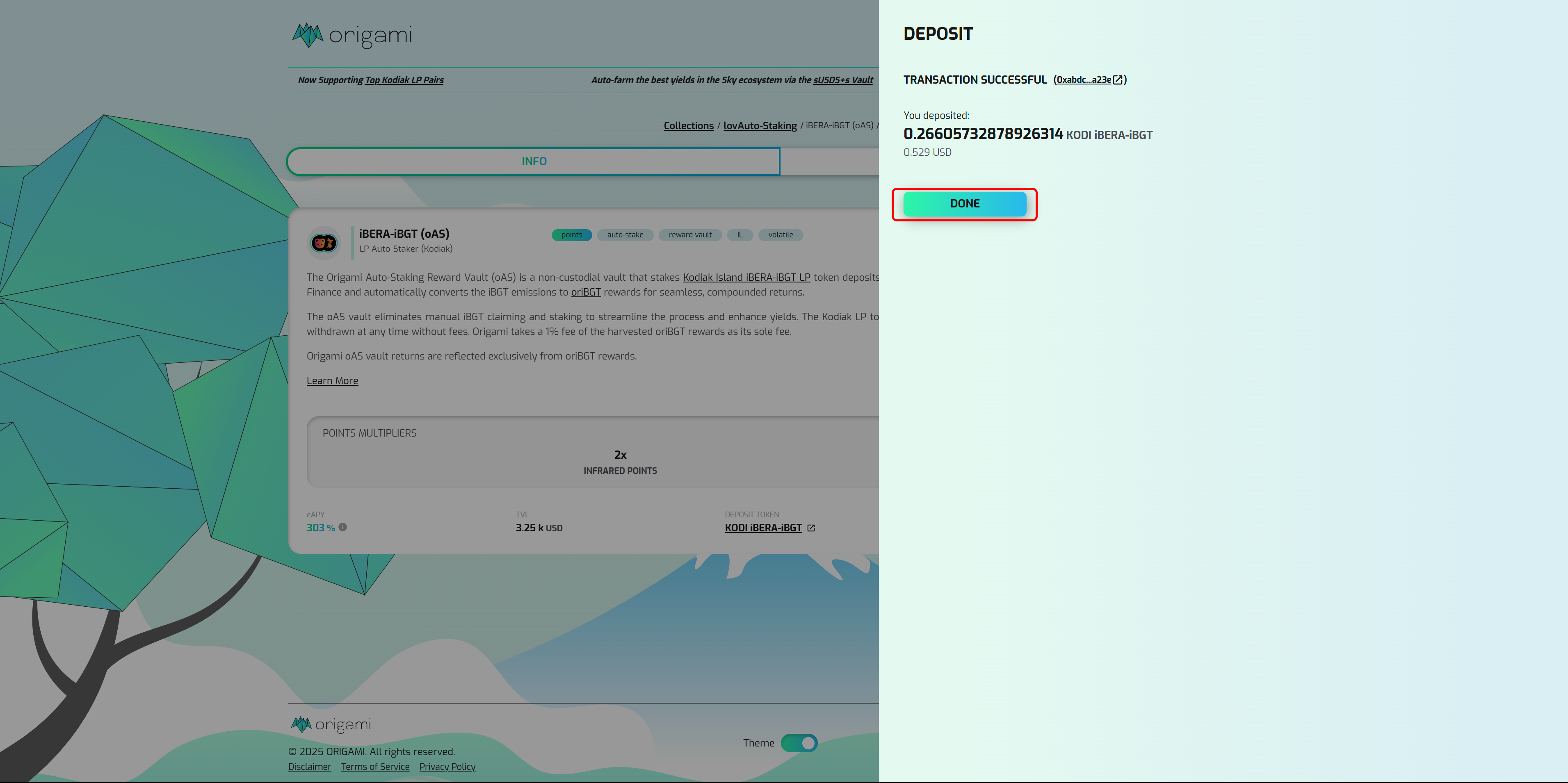 <figure><img src="https://1838495634-files.gitbook.io/~/files/v0/b/gitbook-x-prod.appspot.com/o/spaces%2FuQqfnSZUSHvj0FdEt8I8%2Fuploads%2FeHWWUes9aONPiwvwPOHv%2FoAS%20iBERA-iBGT%20Vault%20Done.png?alt=media&#x26;token=7e925ea7-f8a0-44d7-8fef-cd84a44162a3" alt=""><figcaption><p>Click DONE once the transaction is successful</p></figcaption></figure>