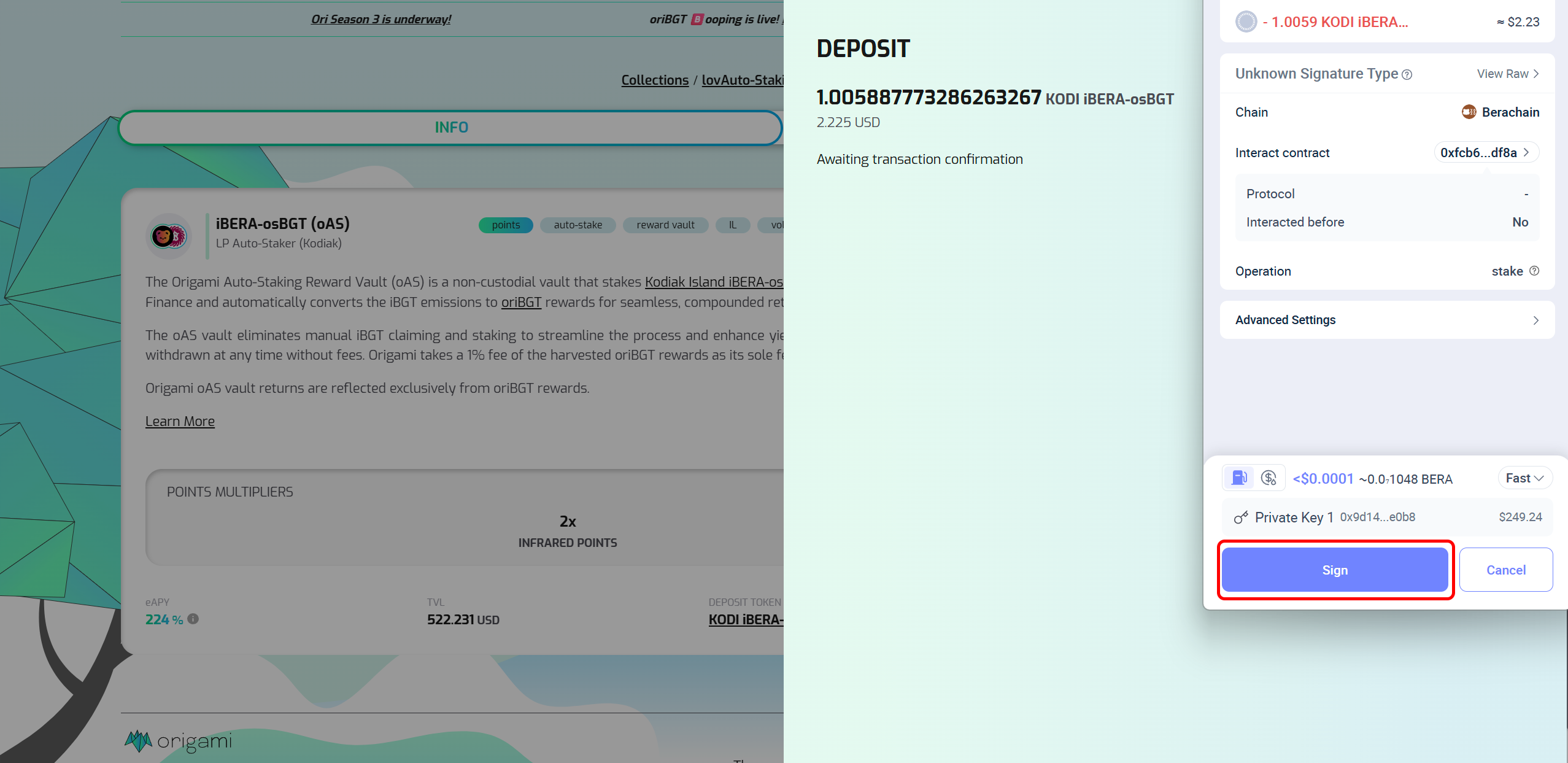 <figure><img src="https://1838495634-files.gitbook.io/~/files/v0/b/gitbook-x-prod.appspot.com/o/spaces%2FuQqfnSZUSHvj0FdEt8I8%2Fuploads%2FSwdN3Rb482OTmii5ZGHT%2FiBERA-osBGT%20OAS%20Confirm%20txn.png?alt=media&#x26;token=90ddaf30-3d8a-4977-9c13-f55ca6cf8a49" alt=""><figcaption><p>Confirm the gas fees to push the transaction through</p></figcaption></figure>