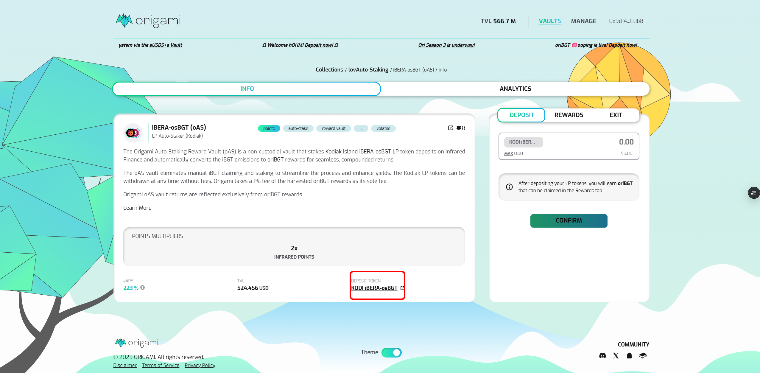 <figure><img src="https://1838495634-files.gitbook.io/~/files/v0/b/gitbook-x-prod.appspot.com/o/spaces%2FuQqfnSZUSHvj0FdEt8I8%2Fuploads%2FtZYaFZcA03yZ3EYEGP6M%2FiBERA-osBGT%20OAS%20Deposit.png?alt=media&#x26;token=87223d92-0f76-41fa-a21d-c0737b065cb2" alt=""><figcaption><p>Click Deposit to access the iBERA-osBGT vault</p></figcaption></figure>