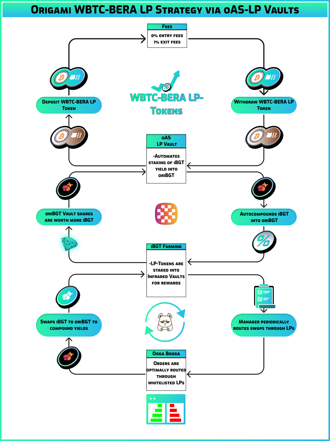 oAS WBTC-BERA is a wrapped Origami liquid yield bearing LP token of WBTC-BERA LP automating harvesting of iBGT for the Infrared Protocol on Berachain and auto-staking the rewards into oriBGT