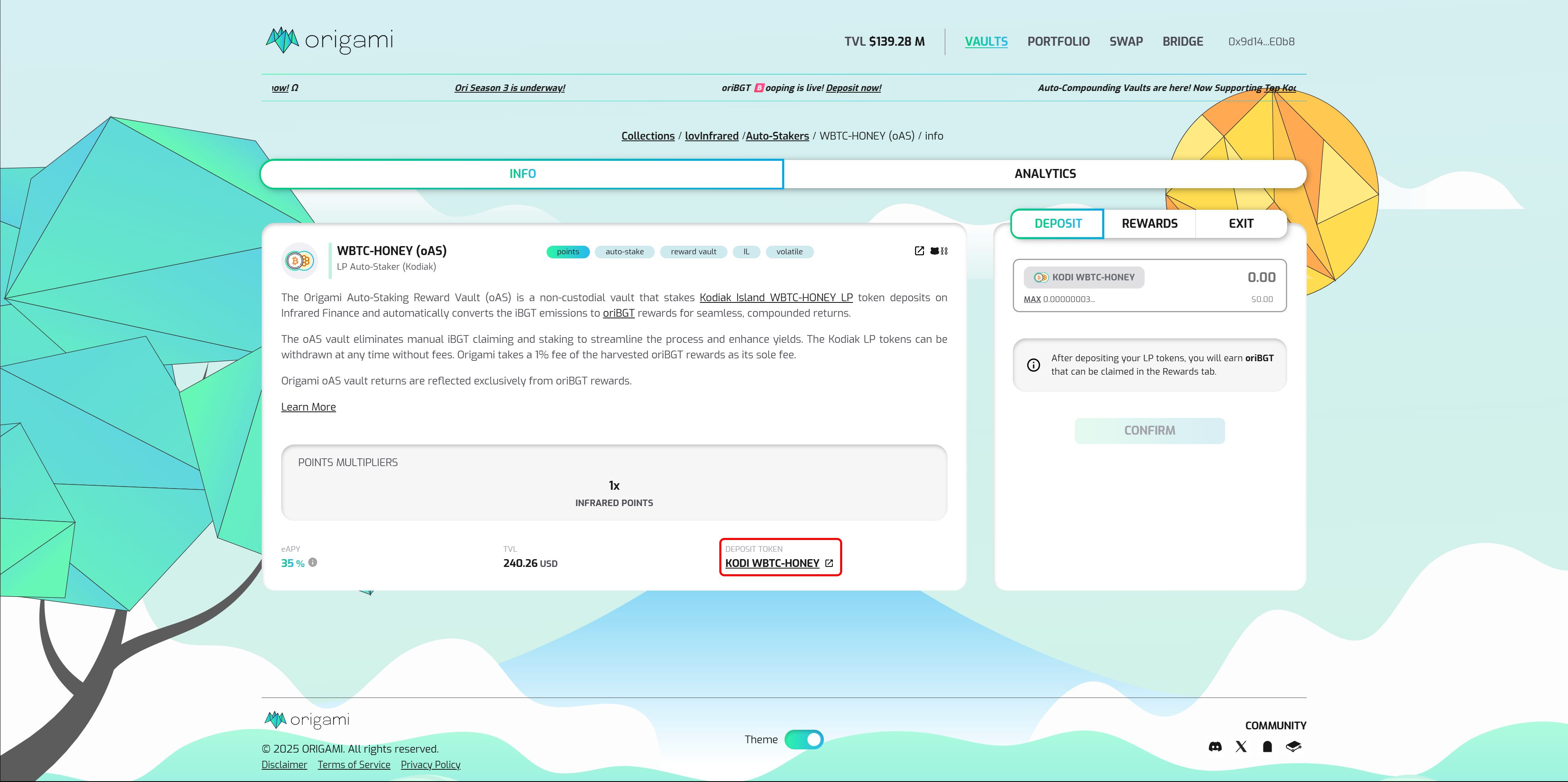 <figure><img src="https://1838495634-files.gitbook.io/~/files/v0/b/gitbook-x-prod.appspot.com/o/spaces%2FuQqfnSZUSHvj0FdEt8I8%2Fuploads%2FE7peYizh6ENTqF8zwcP7%2FoAS%20WBTC-HONEY%20Click%20Deposit.png?alt=media&#x26;token=4894bc76-7fa4-4eb1-9ead-4b738f24ac90" alt=""><figcaption><p>Click Deposit to access the WBTC-HONEY vault</p></figcaption></figure>
