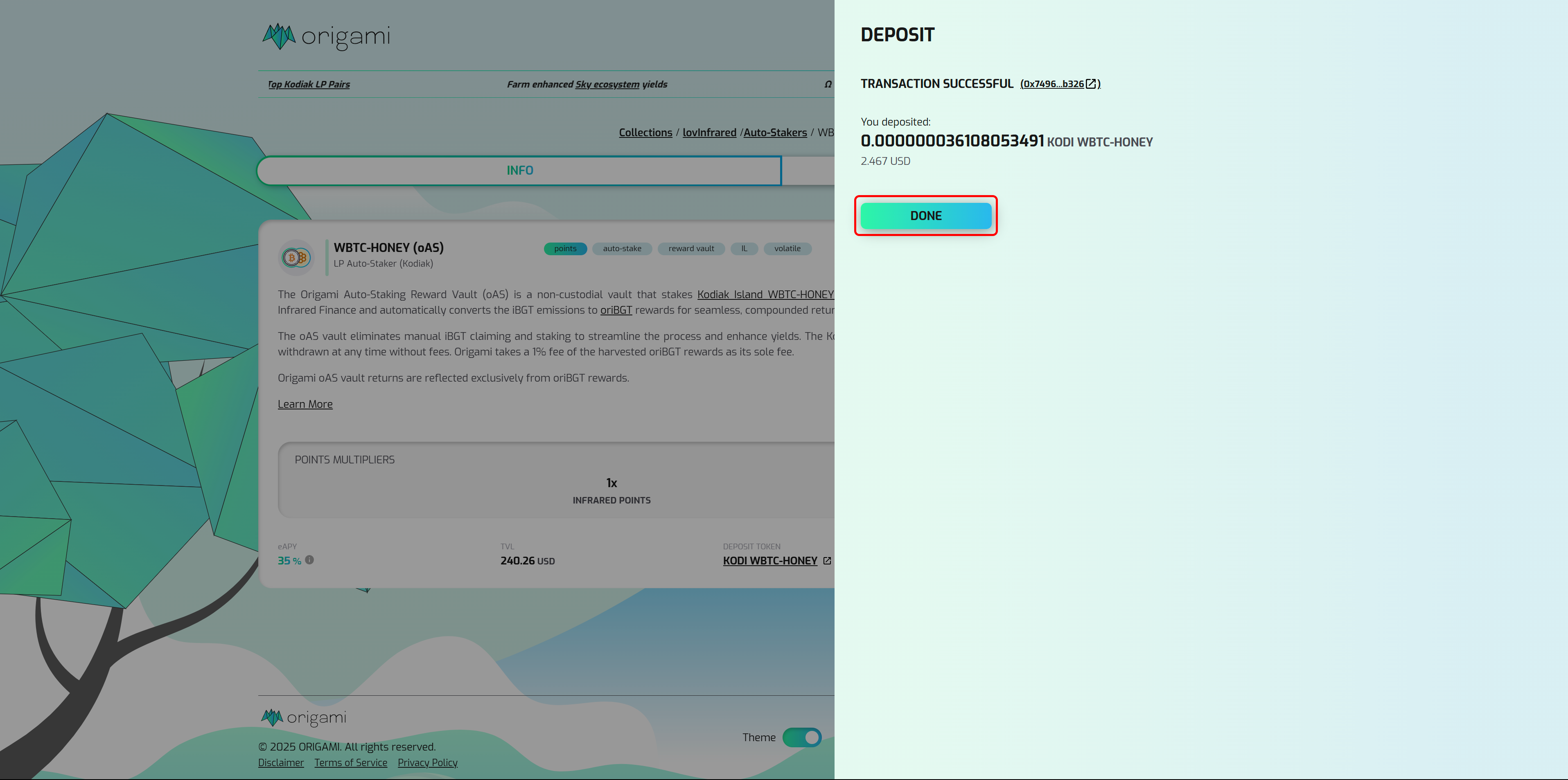 <figure><img src="https://1838495634-files.gitbook.io/~/files/v0/b/gitbook-x-prod.appspot.com/o/spaces%2FuQqfnSZUSHvj0FdEt8I8%2Fuploads%2FMprJQsAZOaq8Vg2xLN6x%2FoAS%20WBTC-HONEY%20Done.png?alt=media&#x26;token=420dab2f-4db7-46d5-9154-a39050f6ddc9" alt=""><figcaption><p>Click DONE once the transaction is successful</p></figcaption></figure>