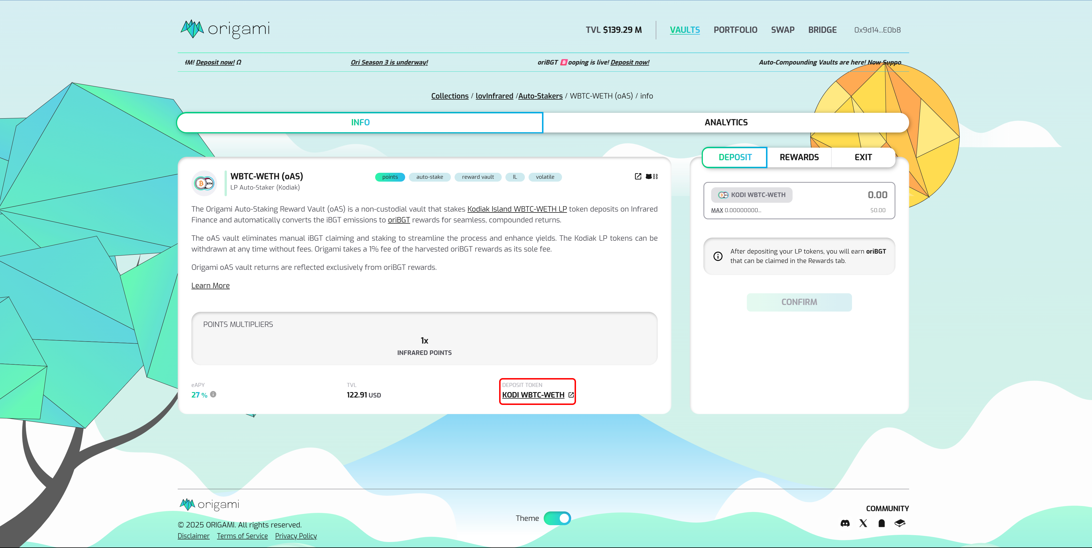 <figure><img src="https://1838495634-files.gitbook.io/~/files/v0/b/gitbook-x-prod.appspot.com/o/spaces%2FuQqfnSZUSHvj0FdEt8I8%2Fuploads%2FTpfcviKb1F6VPL5rFJ46%2FoAS%20WBTC-WETH%20Deposit%20Token.png?alt=media&#x26;token=173ab30f-47dc-4a8c-89f9-d9059067ddad" alt=""><figcaption><p>WBTC-WETH is the only whitelisted assets for deposits into the WBTC-WETH vault</p></figcaption></figure>