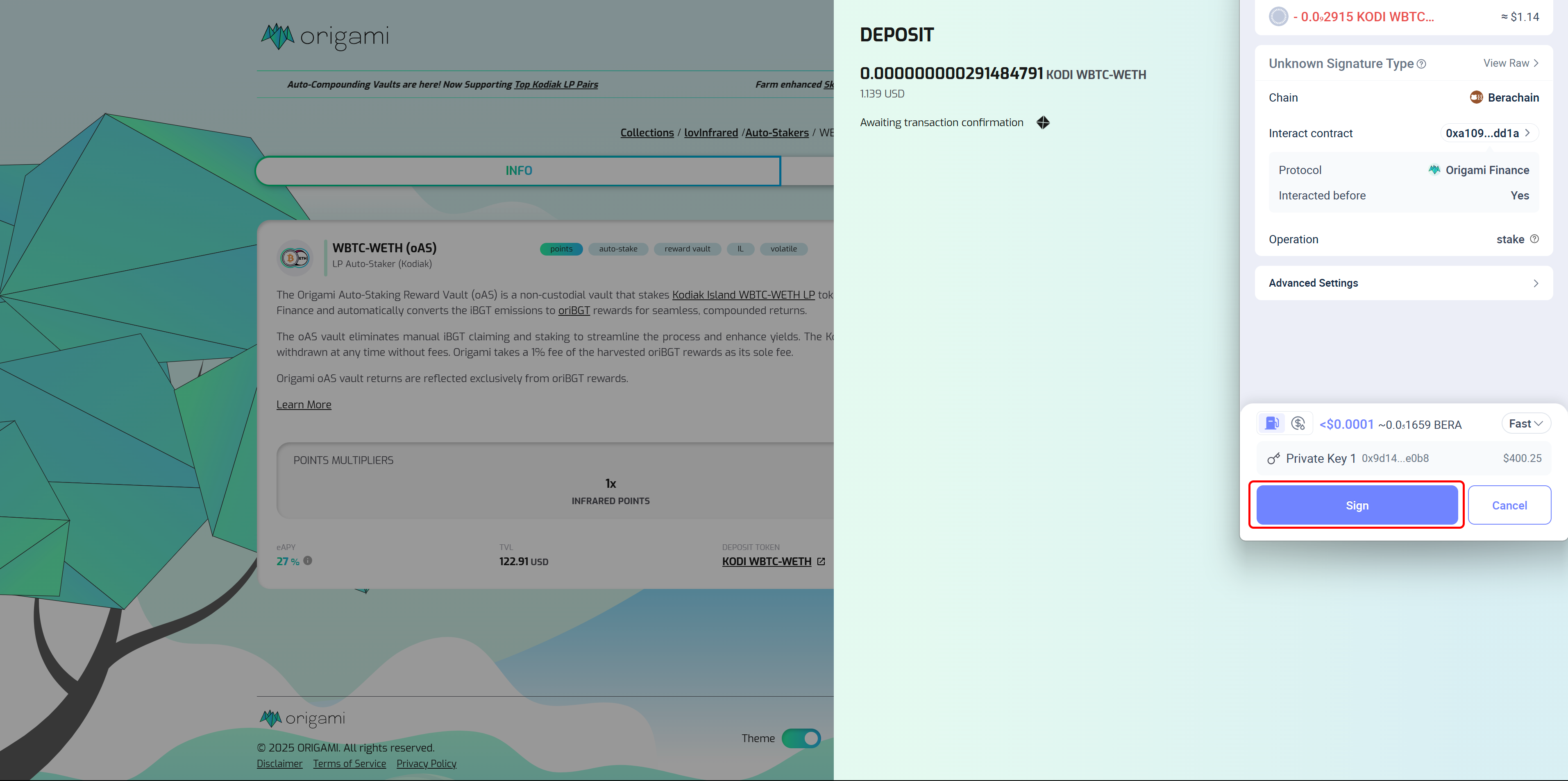 <figure><img src="https://1838495634-files.gitbook.io/~/files/v0/b/gitbook-x-prod.appspot.com/o/spaces%2FuQqfnSZUSHvj0FdEt8I8%2Fuploads%2FN0j39SeekVoRsJowv4ev%2FSign%20Disclaimer.png?alt=media&#x26;token=a03d99e5-025b-4a02-a4d3-7a7631c58648" alt=""><figcaption><p>Click on Sign if all Terms of Service have been checked in order to access the Origami Dapp</p></figcaption></figure>
