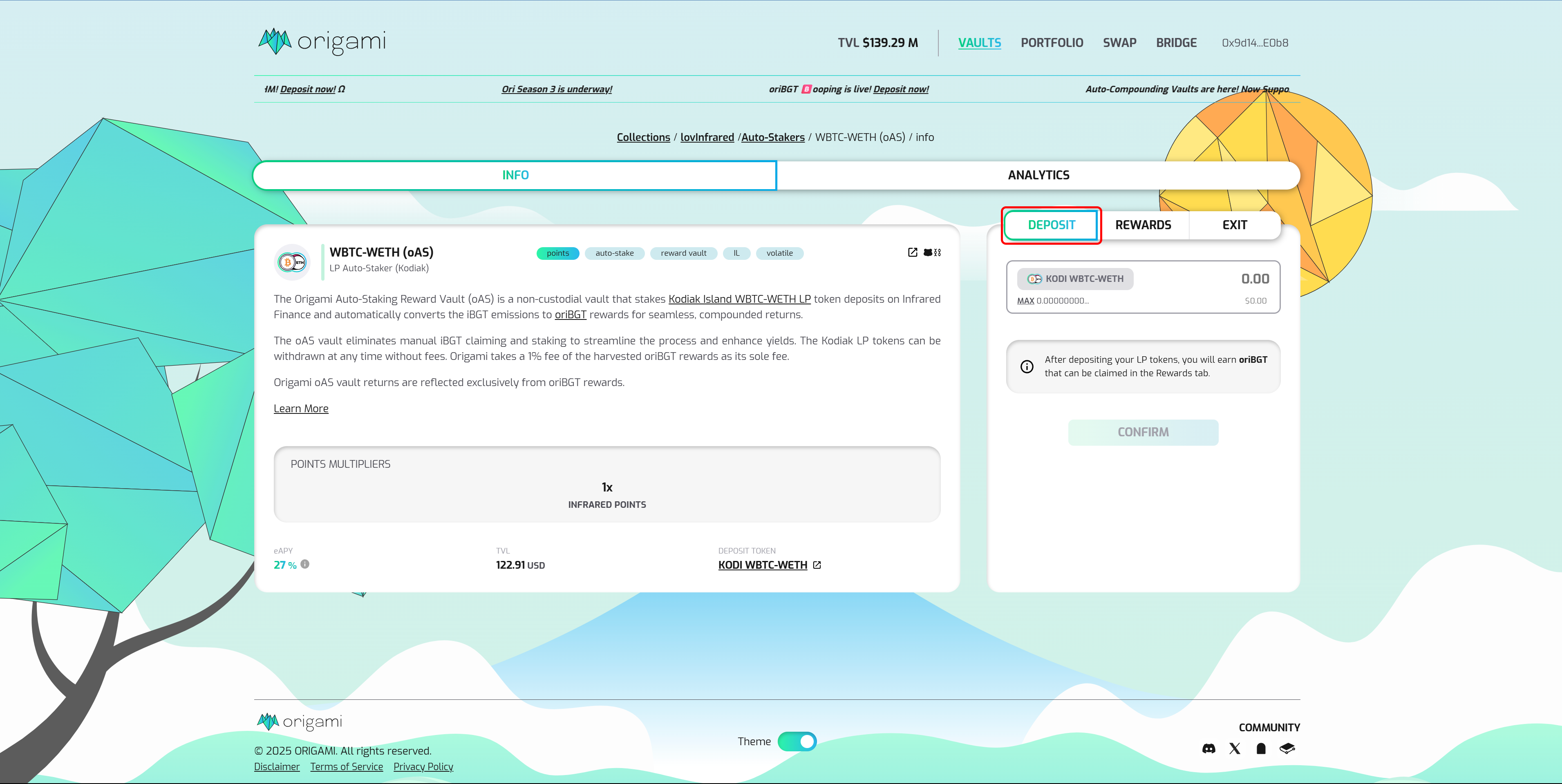<figure><img src="https://1838495634-files.gitbook.io/~/files/v0/b/gitbook-x-prod.appspot.com/o/spaces%2FuQqfnSZUSHvj0FdEt8I8%2Fuploads%2FqvuZ7x4qscseOObHQmEJ%2FoAS%20WBTC-WETH%20Click%20Deposit.png?alt=media&#x26;token=166f2a09-805b-4e98-88be-78fb90270e14" alt=""><figcaption><p>Click Deposit to access the WBTC-WETH vault</p></figcaption></figure>