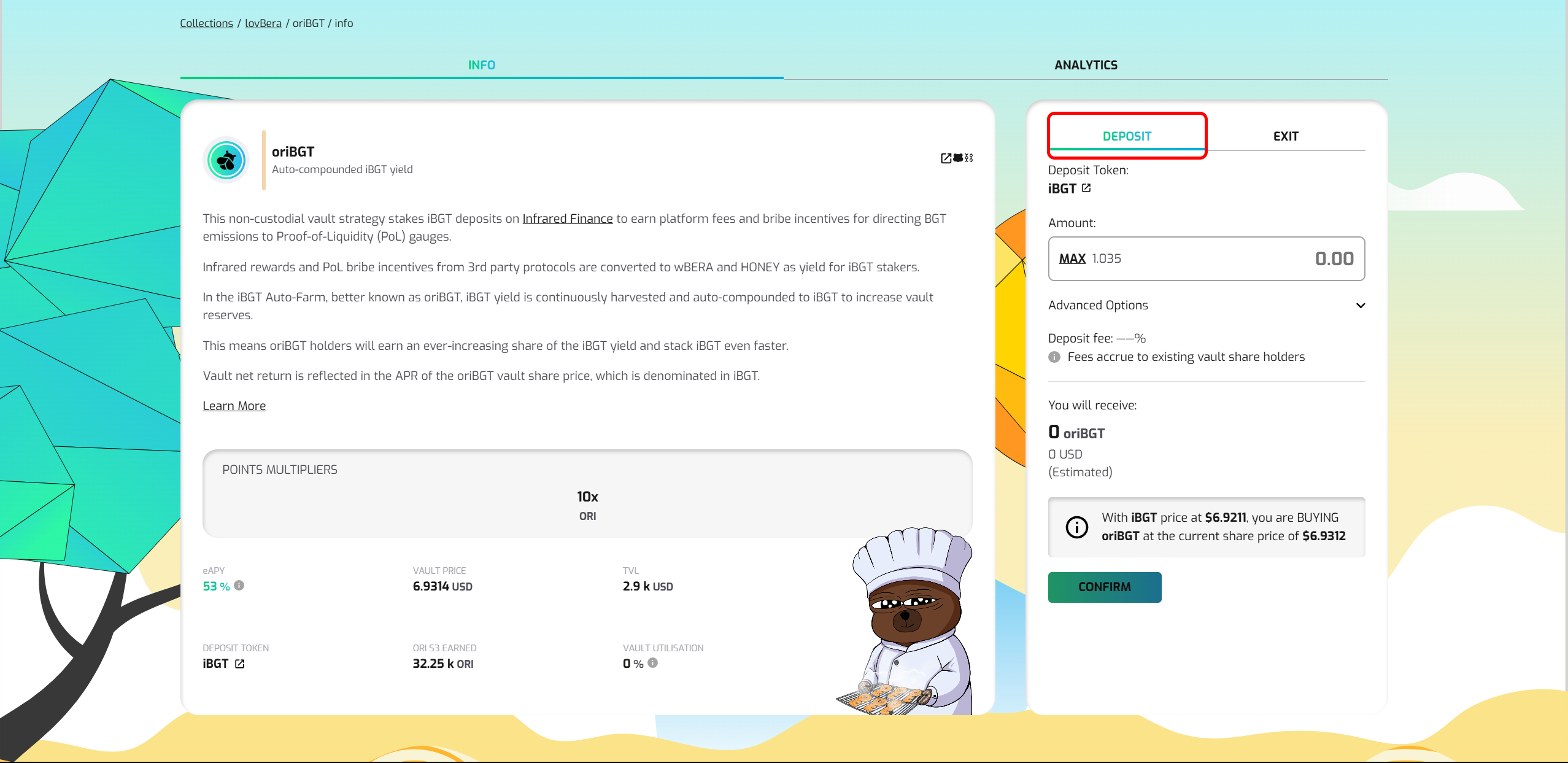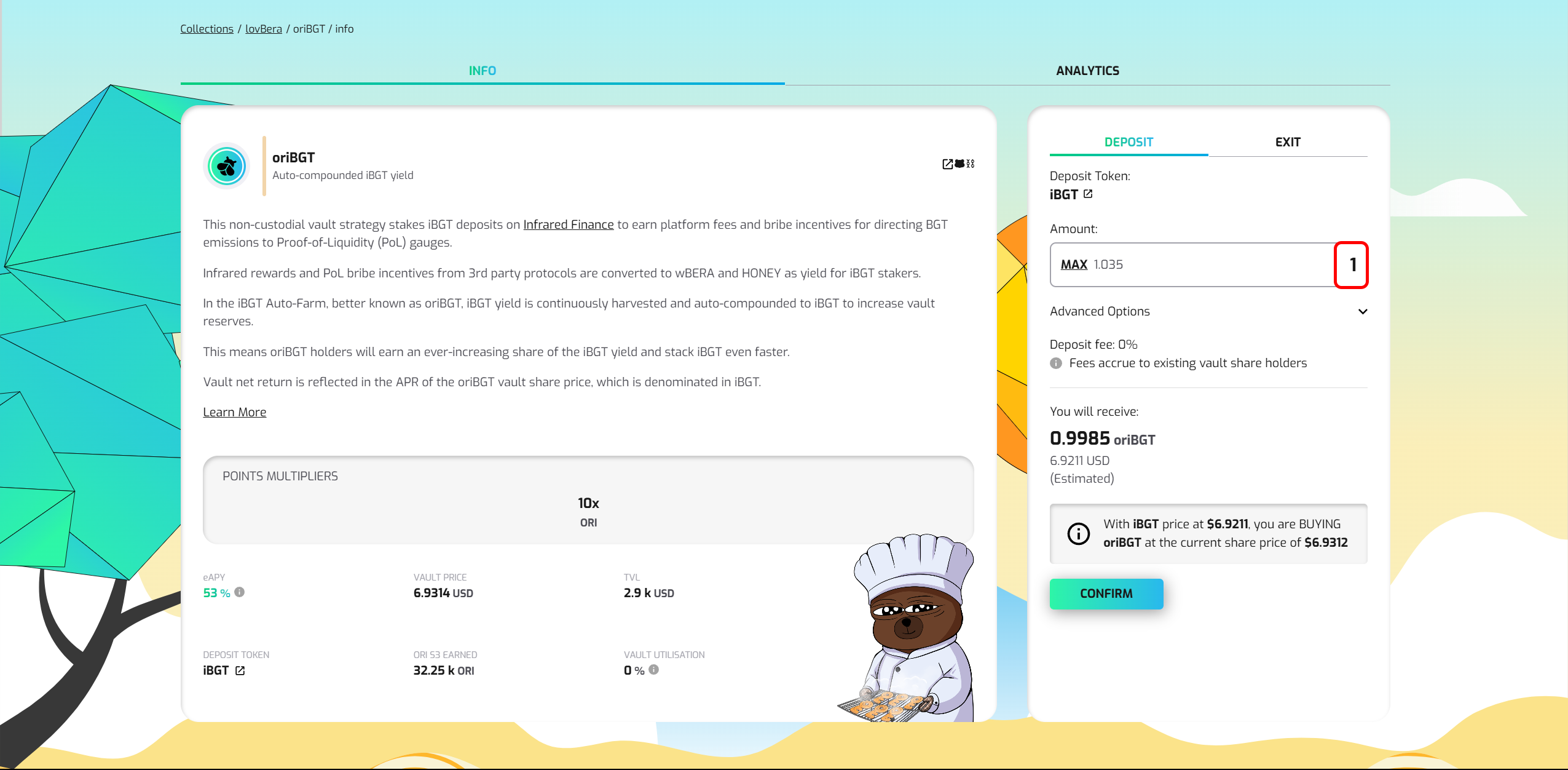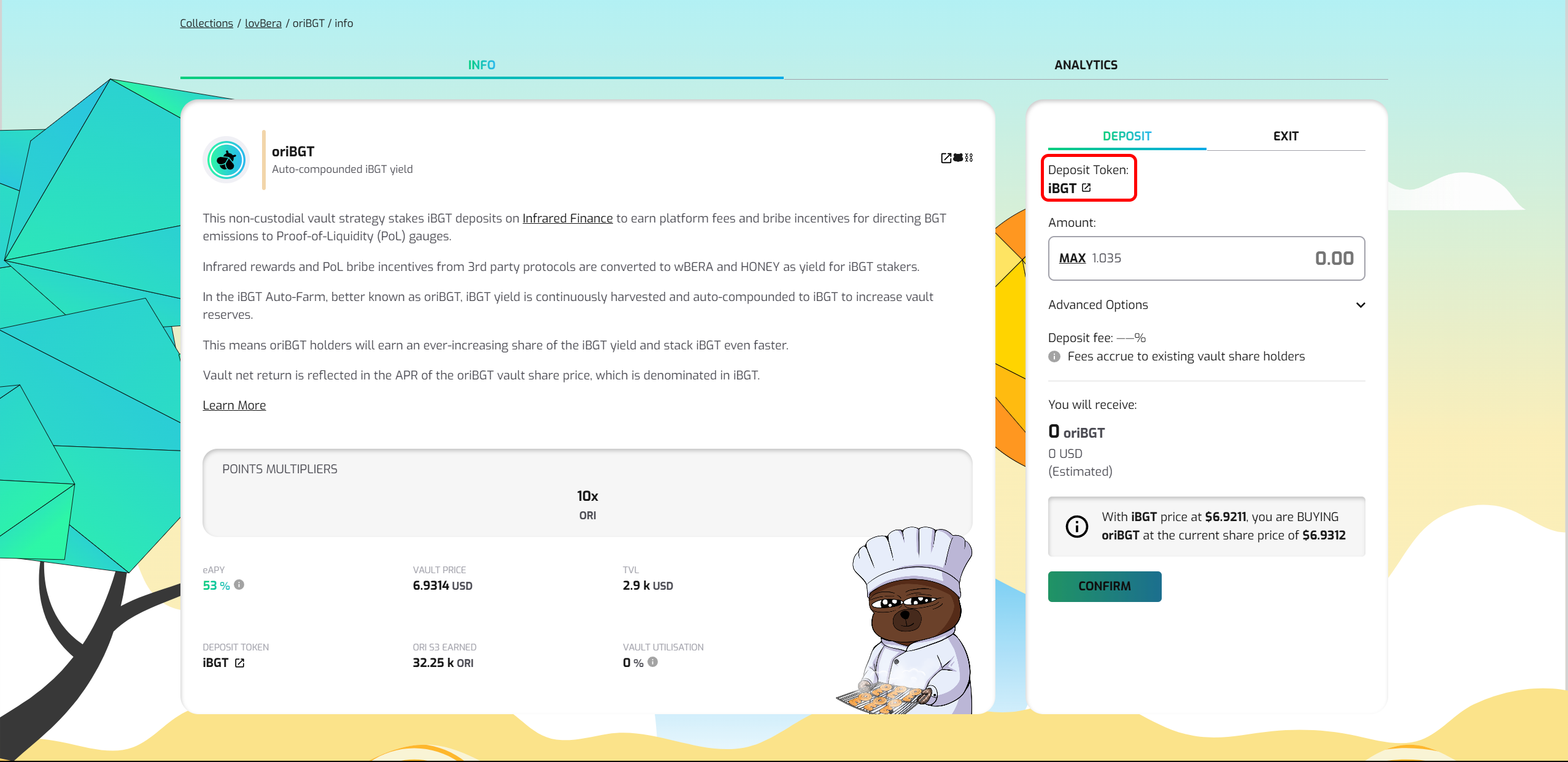 <figure><img src="https://1838495634-files.gitbook.io/~/files/v0/b/gitbook-x-prod.appspot.com/o/spaces%2FuQqfnSZUSHvj0FdEt8I8%2Fuploads%2FDNTLrcXlmm84s3glHF1r%2FDeposit%20Vault.png?alt=media&#x26;token=7c63702d-8c3b-44d1-9656-ed49af31ce44" alt=""><figcaption><p>Click Deposit to access the oriBGT vault</p></figcaption></figure>