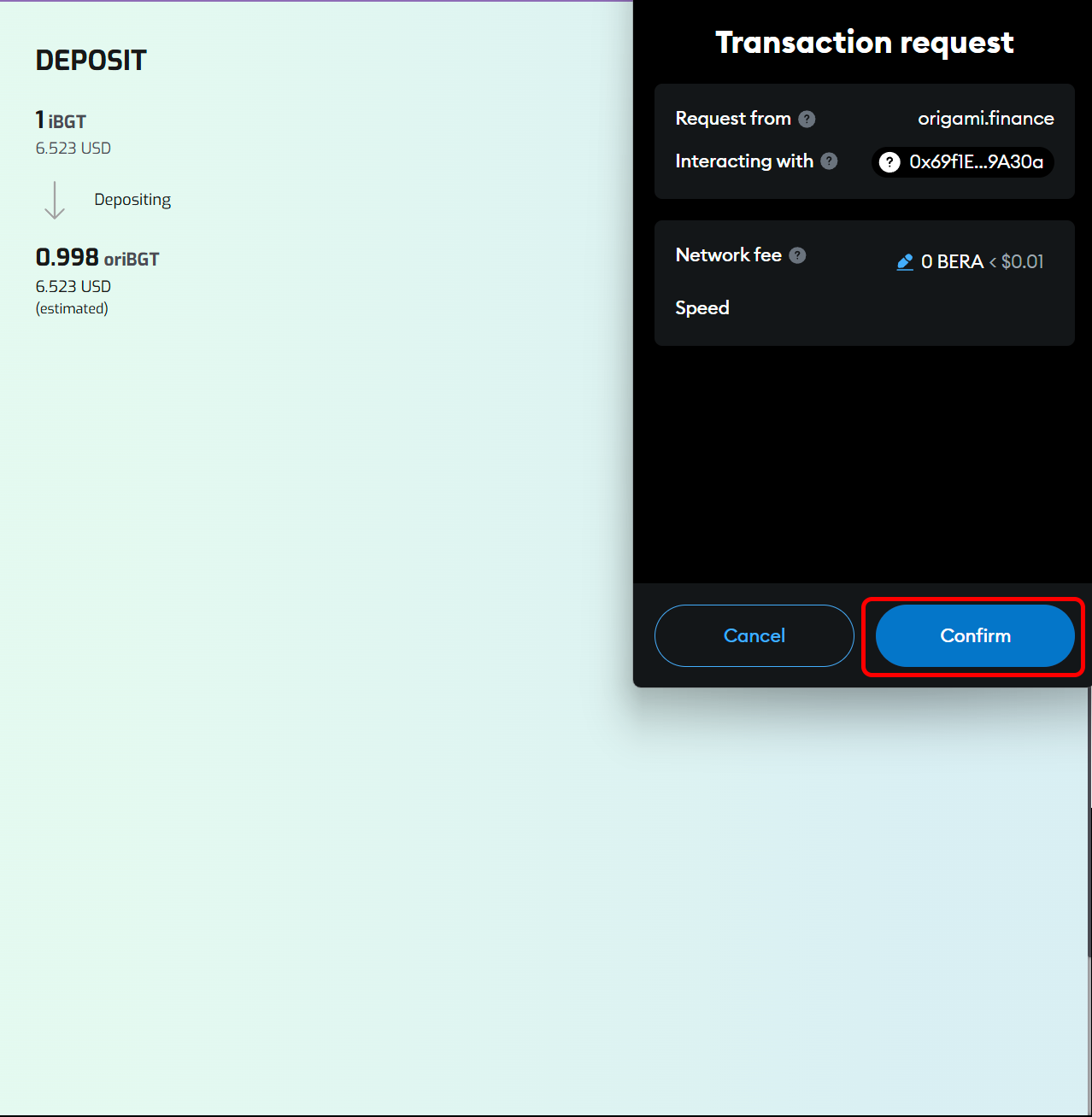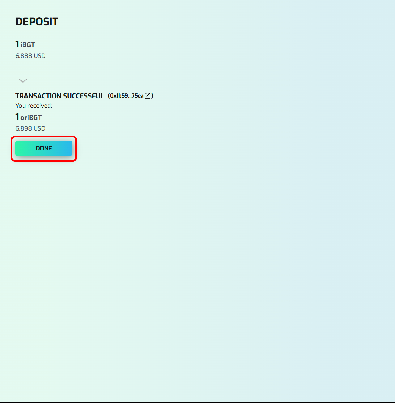 <figure><img src="https://1838495634-files.gitbook.io/~/files/v0/b/gitbook-x-prod.appspot.com/o/spaces%2FuQqfnSZUSHvj0FdEt8I8%2Fuploads%2Fx3TpVCacB55Z3y1oAfJV%2FInput.png?alt=media&#x26;token=8549304f-af52-44b2-8185-9efd6aa091fb" alt=""><figcaption><p>Key in the amount of iBGT tokens you wish to deposit</p></figcaption></figure>