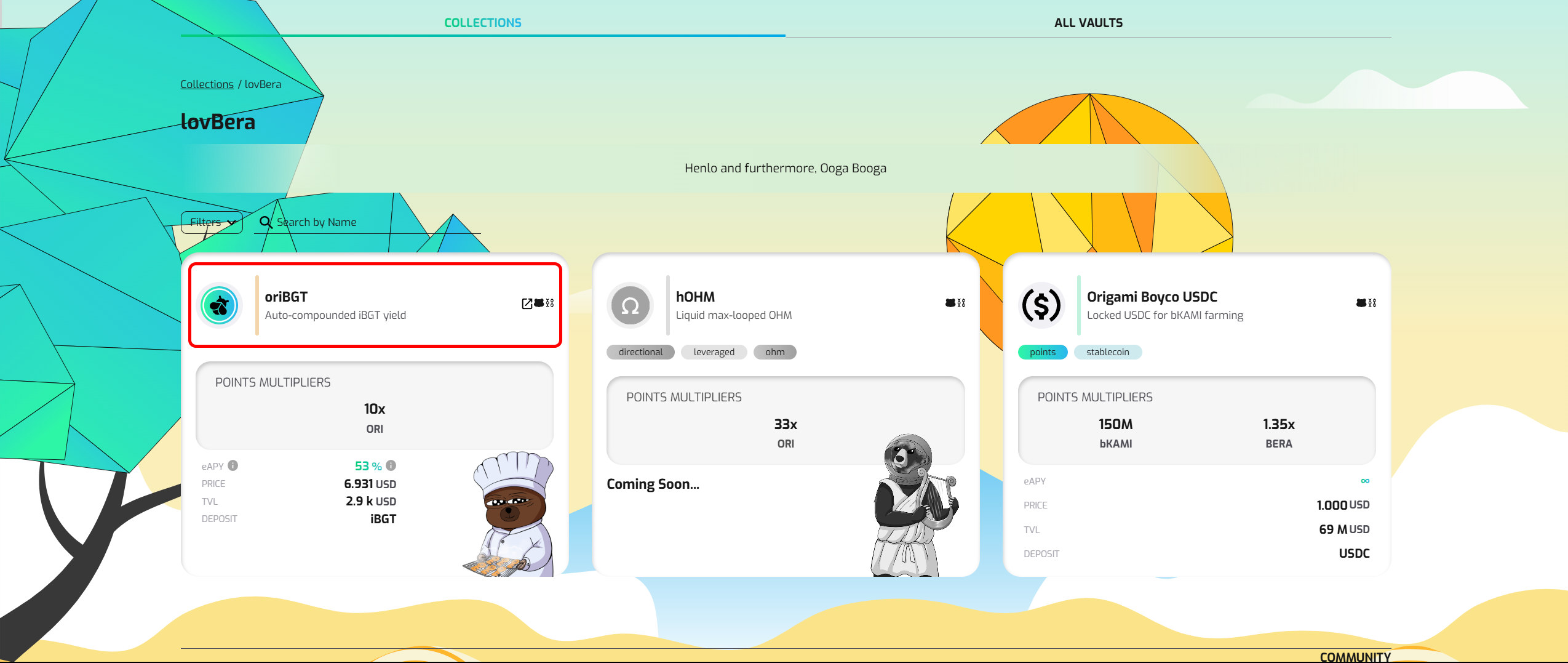 <figure><img src="https://1838495634-files.gitbook.io/~/files/v0/b/gitbook-x-prod.appspot.com/o/spaces%2FuQqfnSZUSHvj0FdEt8I8%2Fuploads%2FiTybKx8j7ZRzlqDtObeA%2FVault%20Collection.png?alt=media&#x26;token=3d1b6adc-2cb9-418d-9a30-7120d9a00aed" alt=""><figcaption><p>Select the oriBGT vault from the list to access the vault features</p></figcaption></figure>