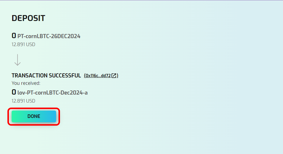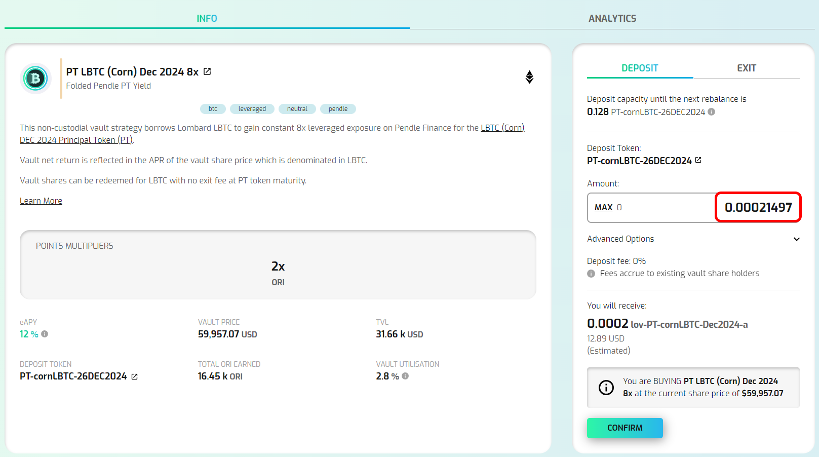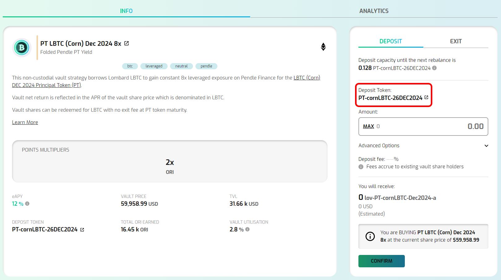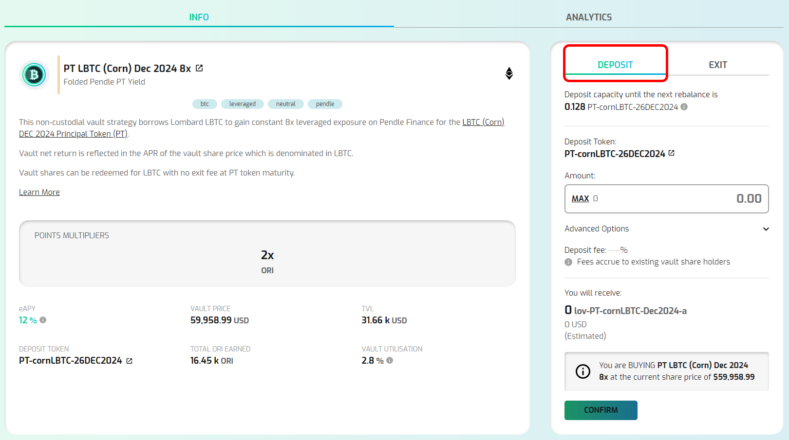 <figure><img src="https://1838495634-files.gitbook.io/~/files/v0/b/gitbook-x-prod.appspot.com/o/spaces%2FuQqfnSZUSHvj0FdEt8I8%2Fuploads%2F0CVtWkFhDPYsrKZx5pG1%2FPT-cornLBTC%20Vault%20Deposit.png?alt=media&#x26;token=dc3b8e6f-b7e3-4168-a294-9229906afa98" alt=""><figcaption><p>Click Deposit to access the PT-cornLBTC-Dec24 8x vault</p></figcaption></figure>