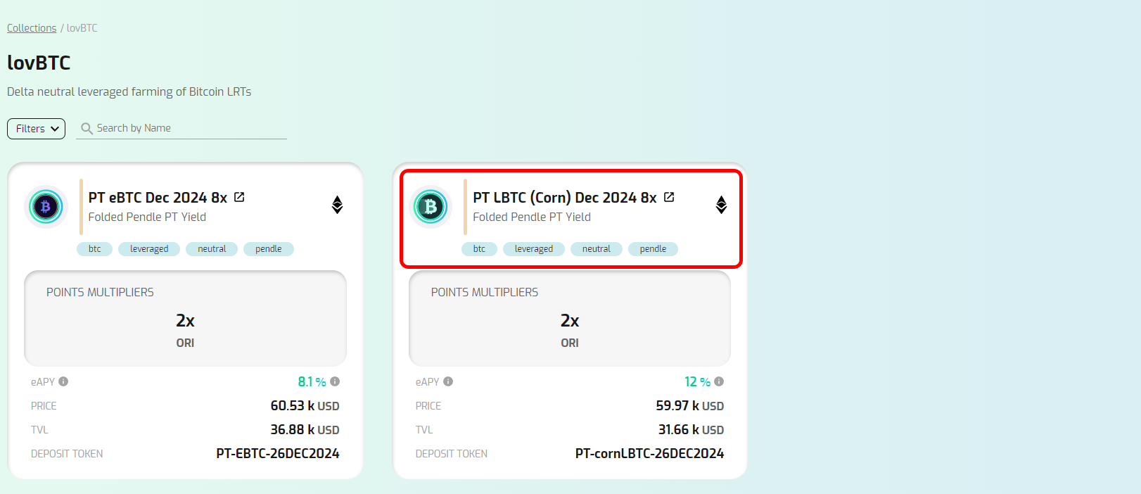 <figure><img src="https://1838495634-files.gitbook.io/~/files/v0/b/gitbook-x-prod.appspot.com/o/spaces%2FuQqfnSZUSHvj0FdEt8I8%2Fuploads%2FawB544C8arSRUshBQivL%2FPT-cornLBTC%20Vault%20Click1.png?alt=media&#x26;token=88186d2b-3953-46bc-9c9e-a9b6cce401e5" alt=""><figcaption><p>Select the PT-cornLBTC-Dec24 8x vault from the list to access the vault features</p></figcaption></figure>