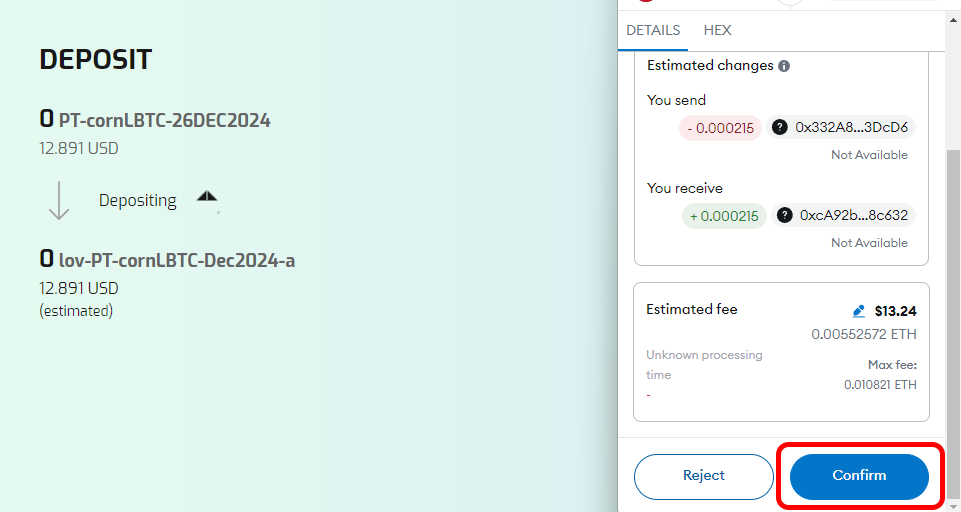 <figure><img src="https://1838495634-files.gitbook.io/~/files/v0/b/gitbook-x-prod.appspot.com/o/spaces%2FuQqfnSZUSHvj0FdEt8I8%2Fuploads%2Fvj7bPQHPZcIqemaxoicr%2FPT-cornLBTC-Dec24%20Confirm%20Txn.png?alt=media&#x26;token=58988cb4-d9d7-4eb9-b405-96c22ca5b5d9" alt=""><figcaption><p>Confirm the gas fees to push the transaction through</p></figcaption></figure>