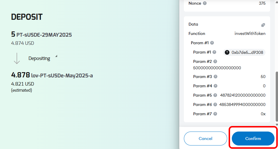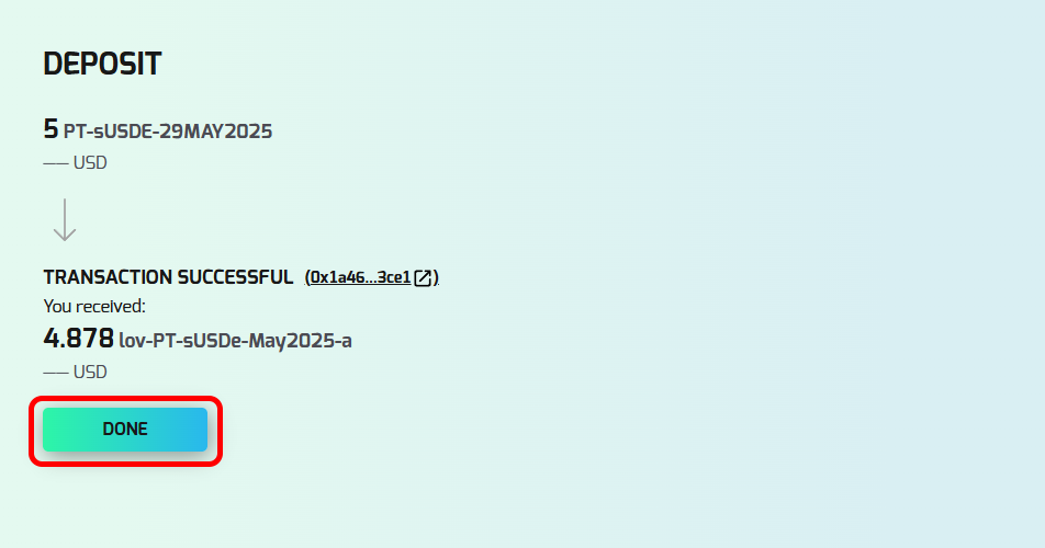 <figure><img src="https://1838495634-files.gitbook.io/~/files/v0/b/gitbook-x-prod.appspot.com/o/spaces%2FuQqfnSZUSHvj0FdEt8I8%2Fuploads%2FbHqgQGbFM9LbjCcSAsfl%2FPT-sUSDe%20May%2025%20Vault%20Deposit.png?alt=media&#x26;token=10c5ff96-2eca-4c17-9e43-ab0d2450a3d9" alt=""><figcaption><p>Click Deposit to access the PT-sUSDe-May-2025 7x vault</p></figcaption></figure>