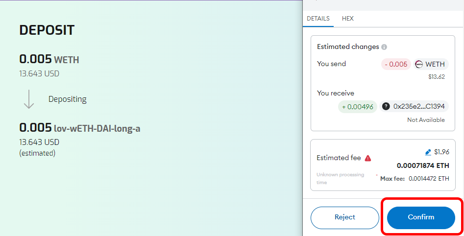 <figure><img src="https://1838495634-files.gitbook.io/~/files/v0/b/gitbook-x-prod.appspot.com/o/spaces%2FuQqfnSZUSHvj0FdEt8I8%2Fuploads%2FcS7Rlh2fjiBPMABKmalN%2Fweth-dai-long%20input.png?alt=media&#x26;token=7c3d810f-316e-40b5-948b-51464acd1f56" alt=""><figcaption><p>Key in the amount of wETH tokens you wish to deposit</p></figcaption></figure>