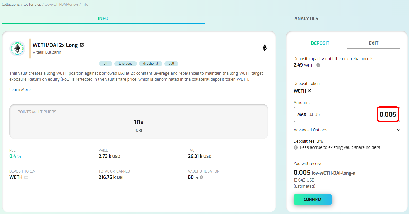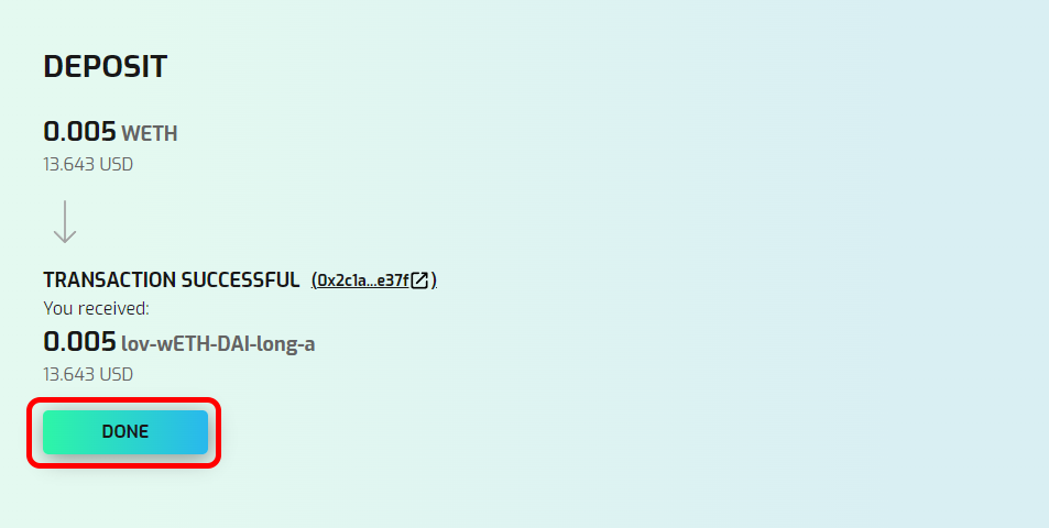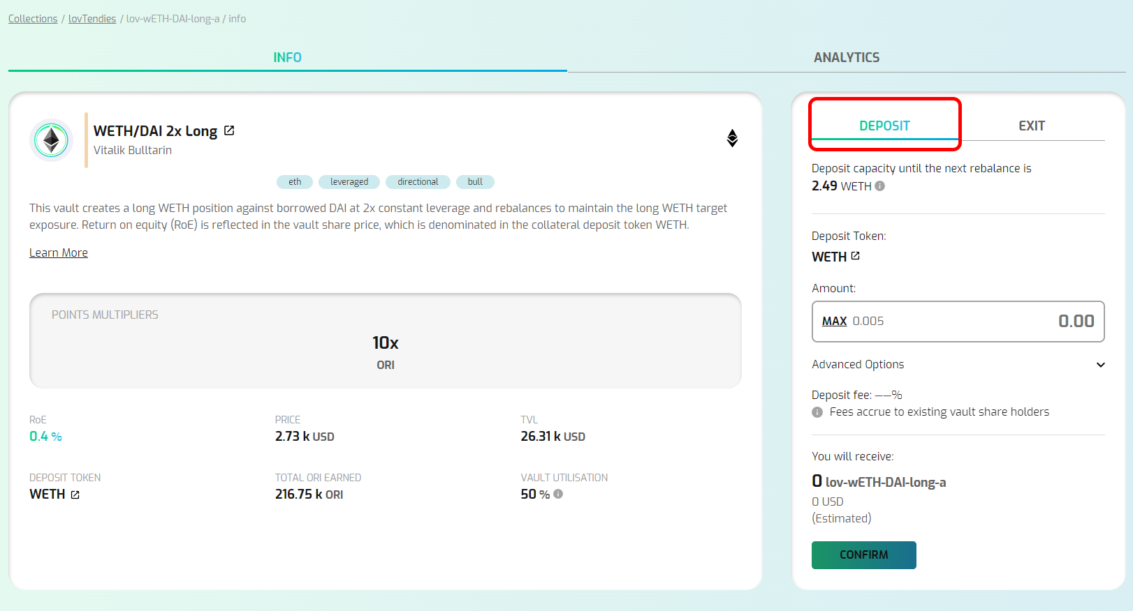 <figure><img src="https://1838495634-files.gitbook.io/~/files/v0/b/gitbook-x-prod.appspot.com/o/spaces%2FuQqfnSZUSHvj0FdEt8I8%2Fuploads%2FVgjKpwdRfazskTx000XY%2FClick%20Deposit.png?alt=media&#x26;token=743fed65-42cb-4a91-b629-1e19609c55be" alt=""><figcaption><p>Click Deposit to access the wETH-DAI-long 2x vault</p></figcaption></figure>