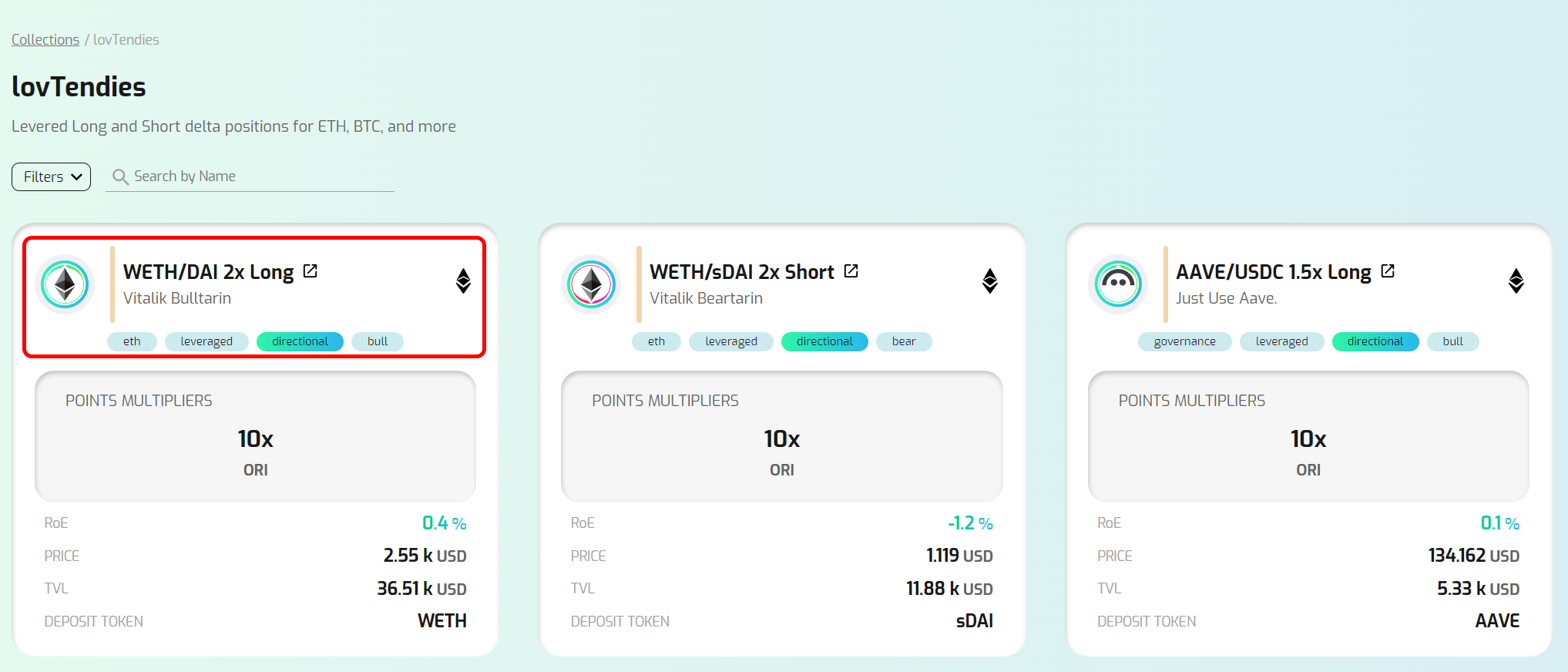 <figure><img src="https://1838495634-files.gitbook.io/~/files/v0/b/gitbook-x-prod.appspot.com/o/spaces%2FuQqfnSZUSHvj0FdEt8I8%2Fuploads%2FvFY6O2lJC4mvWII163Ha%2Fweth-dai-long%20vault2.png?alt=media&#x26;token=e6f056c9-a092-4e18-b050-9fea5e84ef6b" alt=""><figcaption><p>Select the wETH-DAI-long 2x vault from the list to access the vault features</p></figcaption></figure>