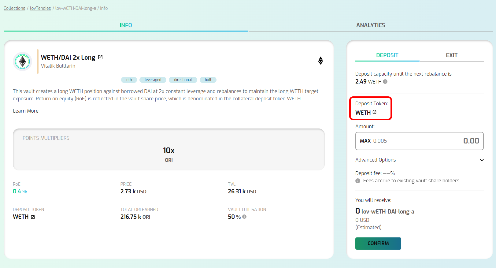 <figure><img src="https://1838495634-files.gitbook.io/~/files/v0/b/gitbook-x-prod.appspot.com/o/spaces%2FuQqfnSZUSHvj0FdEt8I8%2Fuploads%2FyddIcL6TsC8lOrdb6UPV%2FDeposit%20Token.png?alt=media&#x26;token=d982b378-bf91-45b2-867a-67c5b7f978ff" alt=""><figcaption><p>wETH is the only whitelisted assets for deposits into the wETH-DAI-long 2x vault</p></figcaption></figure>