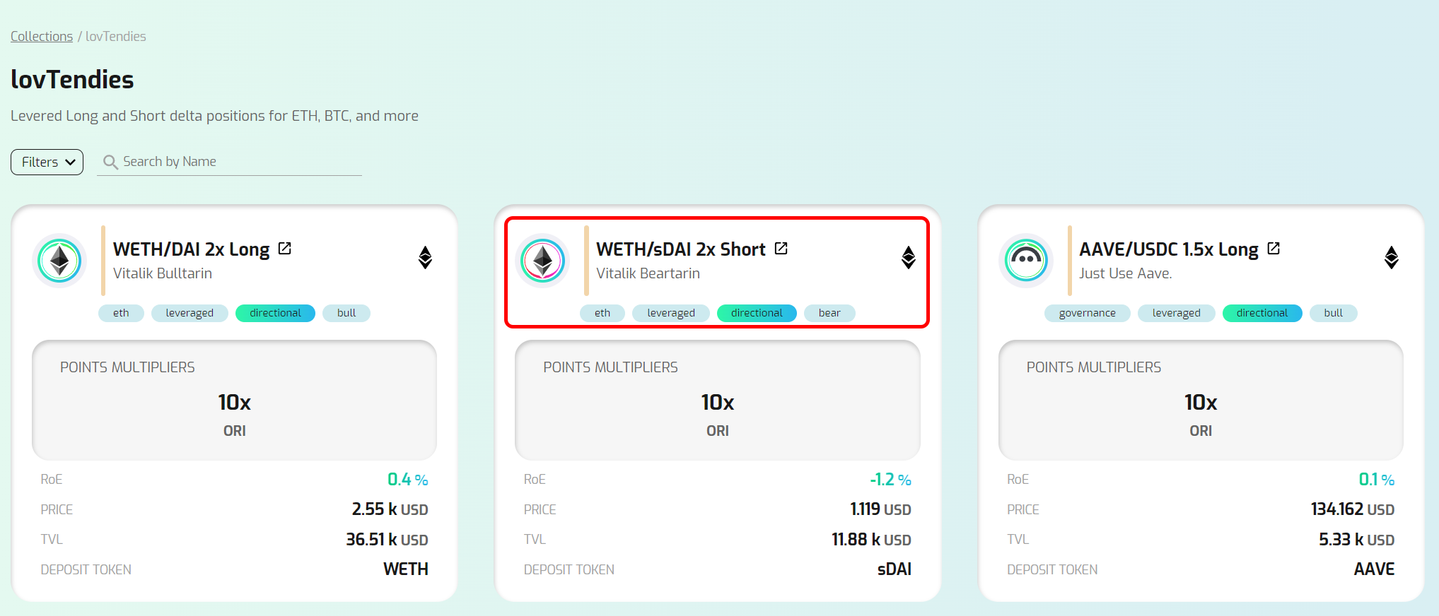 <figure><img src="https://1838495634-files.gitbook.io/~/files/v0/b/gitbook-x-prod.appspot.com/o/spaces%2FuQqfnSZUSHvj0FdEt8I8%2Fuploads%2FKlAcAjEnoe1yeAr3NYJq%2FlovTendies%20weth-sdai%20short%20Vaults2.png?alt=media&#x26;token=cbe51109-bc5e-4ebc-b195-26c49e9c6baf" alt=""><figcaption><p>Select the wETH-sDAI-short 2x vault from the list to access the vault features</p></figcaption></figure>