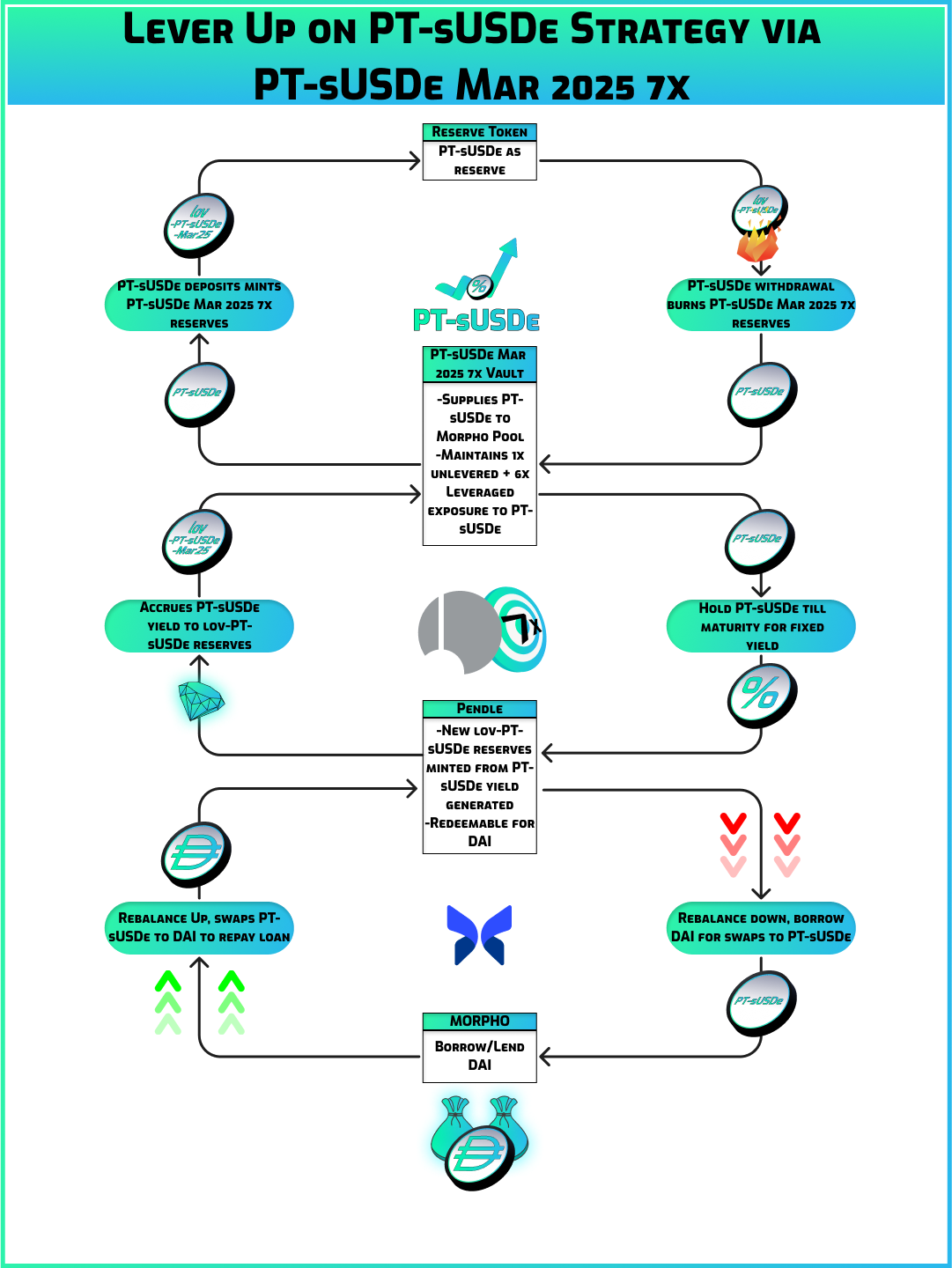 The PT-sUSDe-Mar 2025 7x Vault utilises the Morpho PT-sUSDe/DAI 91.5% LLTV Poolarrow-up-right for its leverage route when rebalancing.
