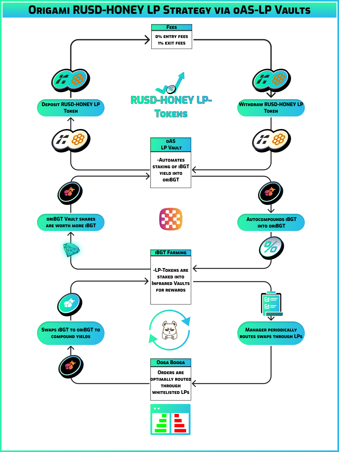 oAS rUSD-HONEY is a wrapped Origami liquid yield bearing LP token of rUSD-HONEY LP automating harvesting of iBGT for the Infrared Protocol on Berachain and auto-staking the rewards into oriBGT