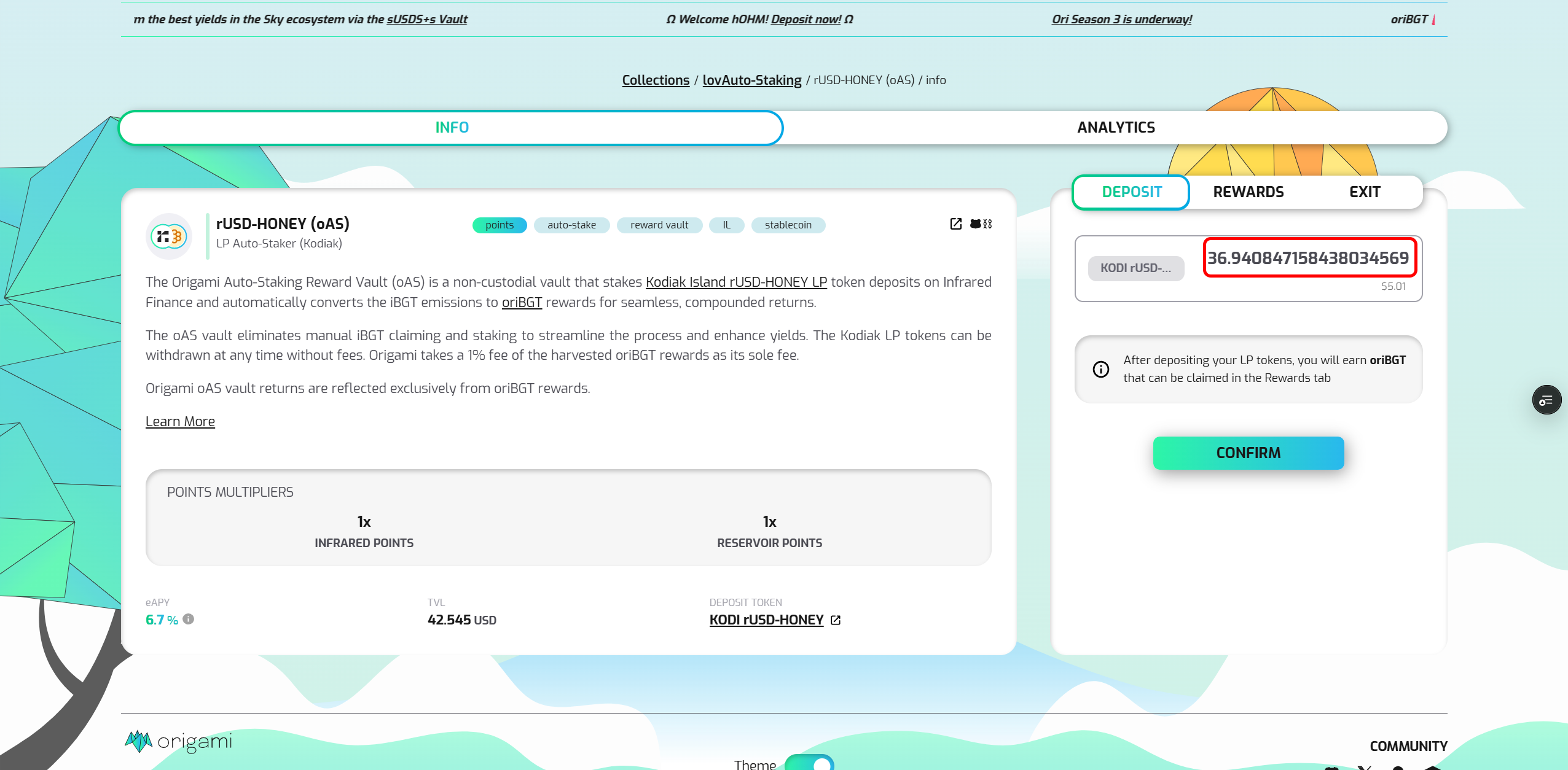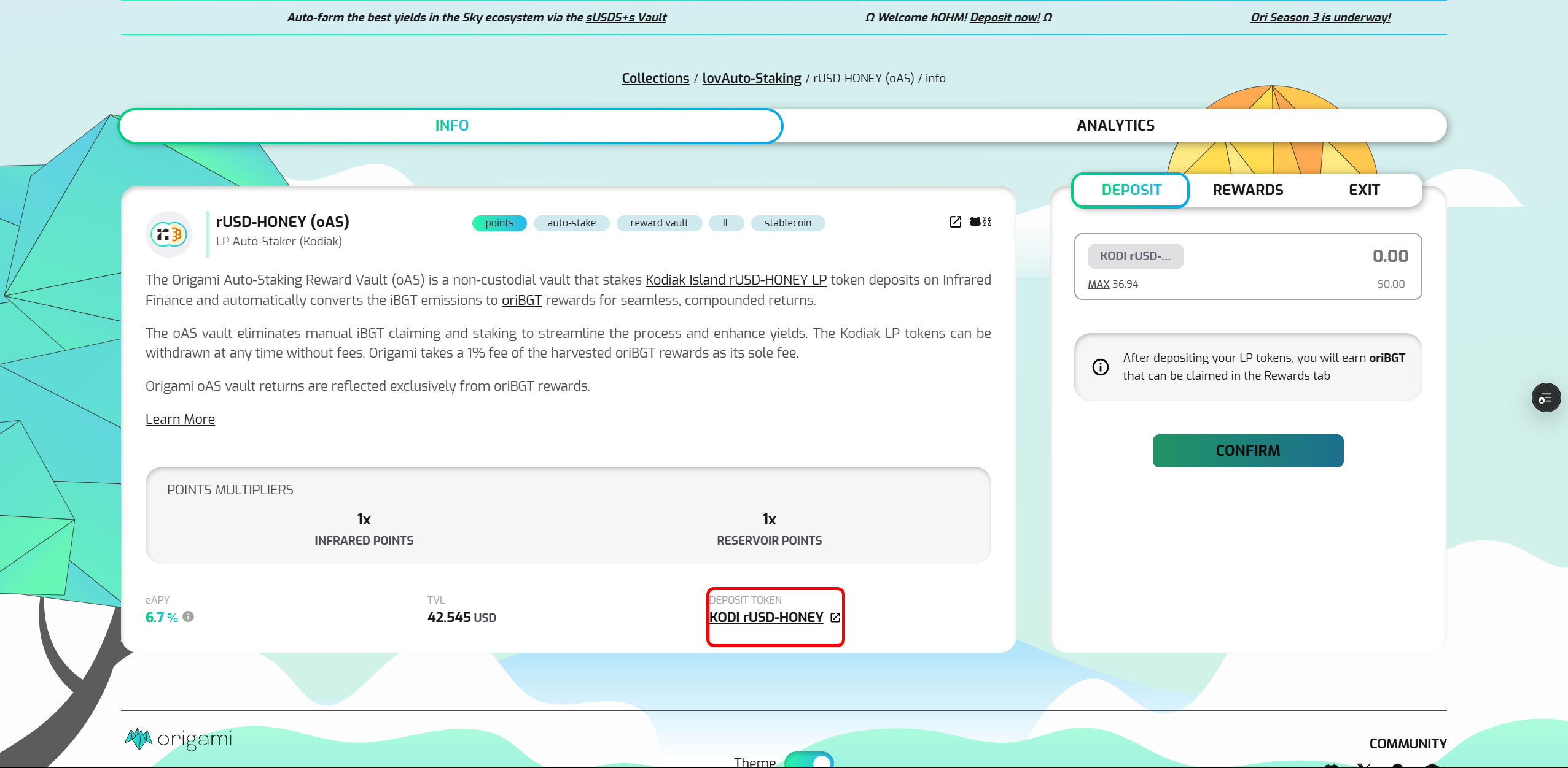 Click Deposit to access the rUSD-HONEY vault