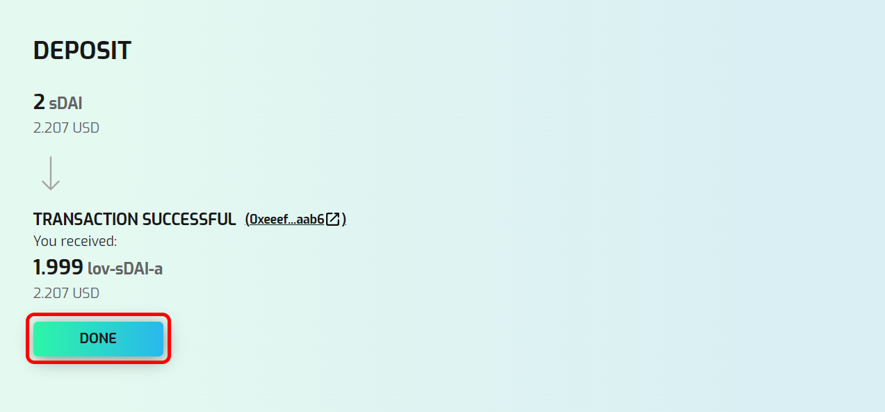 <figure><img src="https://1838495634-files.gitbook.io/~/files/v0/b/gitbook-x-prod.appspot.com/o/spaces%2FuQqfnSZUSHvj0FdEt8I8%2Fuploads%2FORqjLbwdNwcN23O9gfy3%2FDeposit%20Done.png?alt=media&#x26;token=6302f25a-4793-4875-8421-7df821a4dd84" alt=""><figcaption><p>Click DONE once the transaction is successful</p></figcaption></figure>