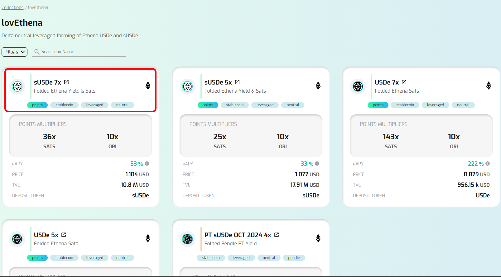<figure><img src="https://1838495634-files.gitbook.io/~/files/v0/b/gitbook-x-prod.appspot.com/o/spaces%2FuQqfnSZUSHvj0FdEt8I8%2Fuploads%2FHSaw23Po3waIh8wRL99w%2FsUSDe%207x%20Vault.png?alt=media&#x26;token=71ff4561-e4f9-40e5-8647-a5a64b73d5f2" alt=""><figcaption><p>Select the sUSDe 7x vault from the Collection to access the vault features</p></figcaption></figure>