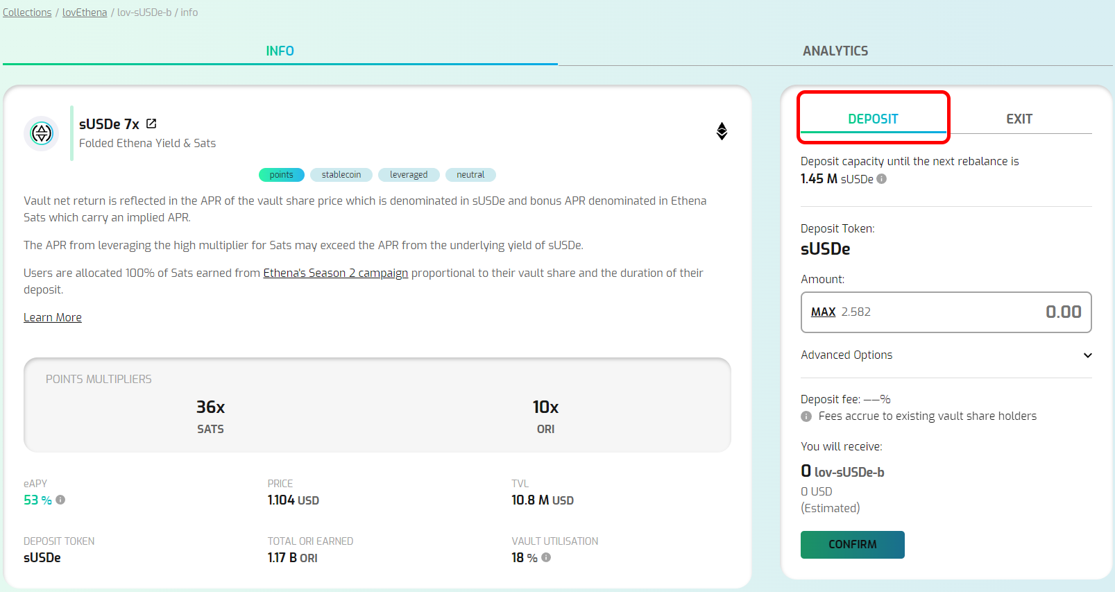<figure><img src="https://1838495634-files.gitbook.io/~/files/v0/b/gitbook-x-prod.appspot.com/o/spaces%2FuQqfnSZUSHvj0FdEt8I8%2Fuploads%2FRZIGIUf71sP1XWwuGMO3%2FsUSDe%207x%20Deposit.png?alt=media&#x26;token=715f5369-7432-446c-b185-2c73ab6b75d2" alt=""><figcaption><p>Click Deposit to access the sUSDe 7x vault</p></figcaption></figure>