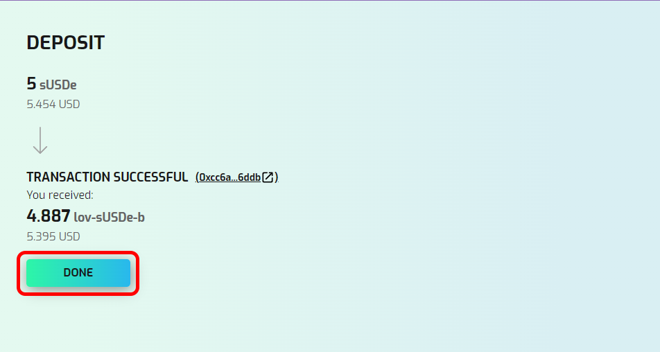 <figure><img src="https://1838495634-files.gitbook.io/~/files/v0/b/gitbook-x-prod.appspot.com/o/spaces%2FuQqfnSZUSHvj0FdEt8I8%2Fuploads%2Ff3j1WtksTXyegjjuIXLp%2FsUSDe%207x%20Done.png?alt=media&#x26;token=20b7588e-8871-4a1a-a7e0-935f2a458f52" alt=""><figcaption><p>Click DONE once the transaction is successful</p></figcaption></figure>