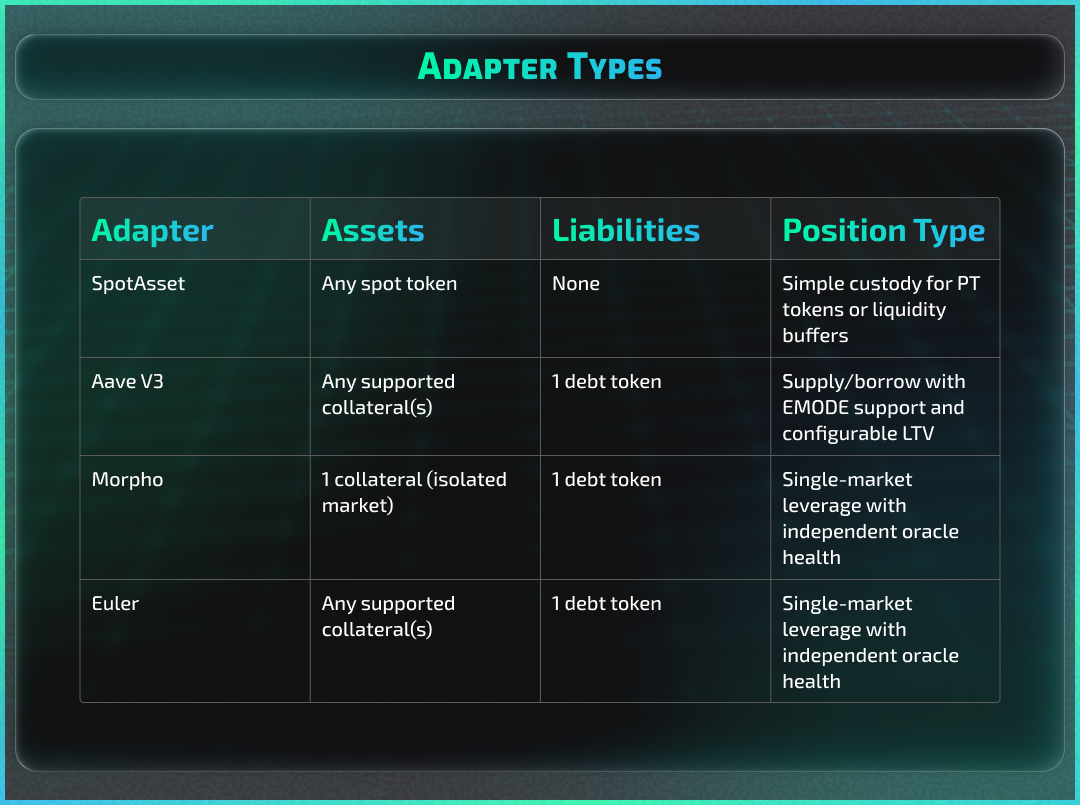 Adapters are not routing contracts or general-purpose integrations. Each adapter is scoped to a single position with a fixed token configuration.